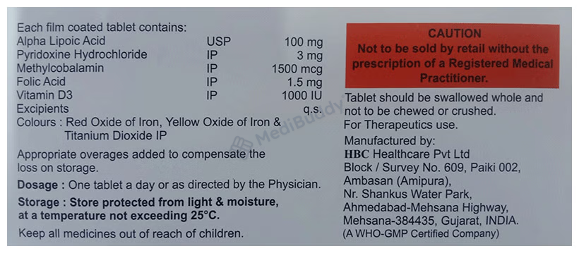 The tablet also contains other important nutrients such as folic acid, pyridoxine hydrochloride, methylcobalamin, and vitamin D3. Methylcobalamin is essential for maintaining the health of neurons, while alpha-lipoic acid acts as a powerful antioxidant that protects neurons from oxidative stress. The combination of methylcobalamin, pyridoxine, and folic acid works to lower homocysteine levels, a significant risk factor for atherosclerosis. This combination further helps in reducing oxidative stress and preventing damage to cells and tissues.