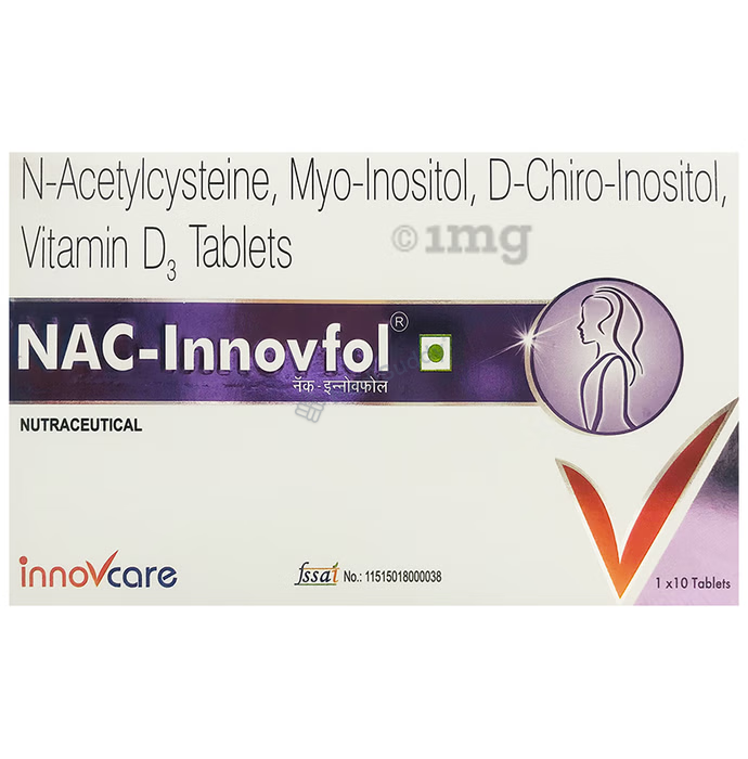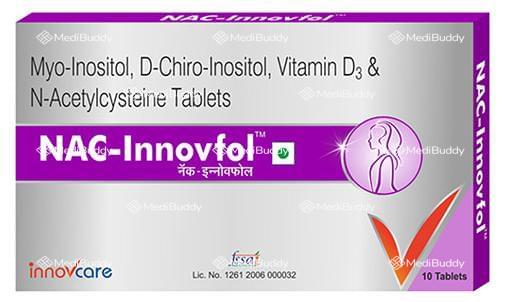 Nac-Innovfol Tablet is a nutritional supplement designed to enhance the reproductive health of women. It consists of active ingredients such as D-chiro-Inositol, N-acetyl L-cysteine, Myo-inositol, and Vitamin D3. These components work synergistically to address hormonal imbalances and menstrual irregularities in women suffering from conditions like Polycystic Ovary Syndrome (PCOS).