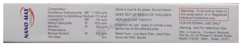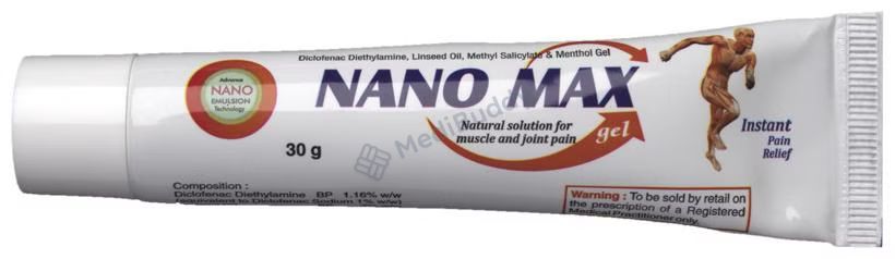 Nanomax Gel is a topical medication designed to alleviate pain when applied directly to the skin. It functions by hindering the release of specific chemical messengers responsible for pain and swelling, ultimately improving blood circulation at the application site and inducing a cooling sensation on the skin. This gel is meant for external use exclusively, and it is crucial to follow the precise dosage and duration as instructed by a healthcare professional to avoid potential side effects. Prior to application, it is imperative to read and adhere to the directions provided on the label. To use Nanomax Gel, ensure the affected area is clean and dry before gently applying the gel. It is essential to wash your hands thoroughly before and after using the gel, unless your hands are the area of application.