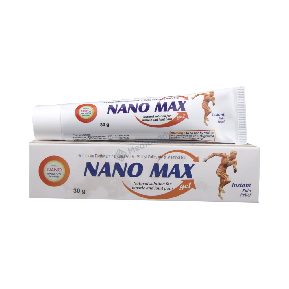 Moreover, Nanomax Gel 30 gm is a specifically formulated topical analgesic aimed at relieving acute musculoskeletal pain and pain associated with osteoarthritis in joints. Comprising components such as Diclofenac, Methyl salicylate, Linseed oil, and Menthol, this gel works by initially cooling the skin, followed by warming it up, thereby disrupting the transmission of pain signals through nerves. By blocking the release of pain-causing chemical messengers alongside reducing redness and swelling, Nanomax Gel 30 gm effectively alleviates pain, swelling, and stiffness in joints, fostering enhanced mobility and flexibility.