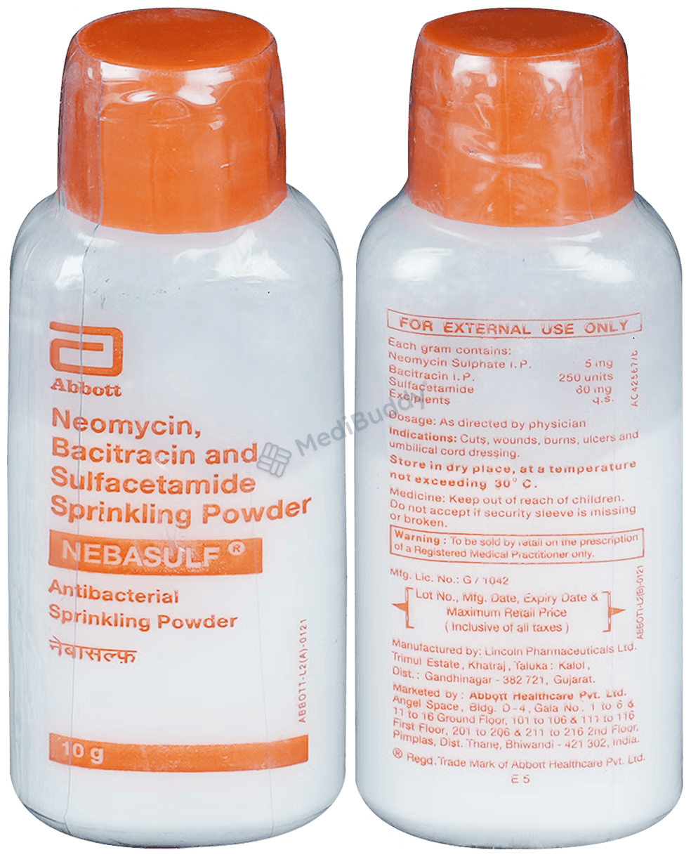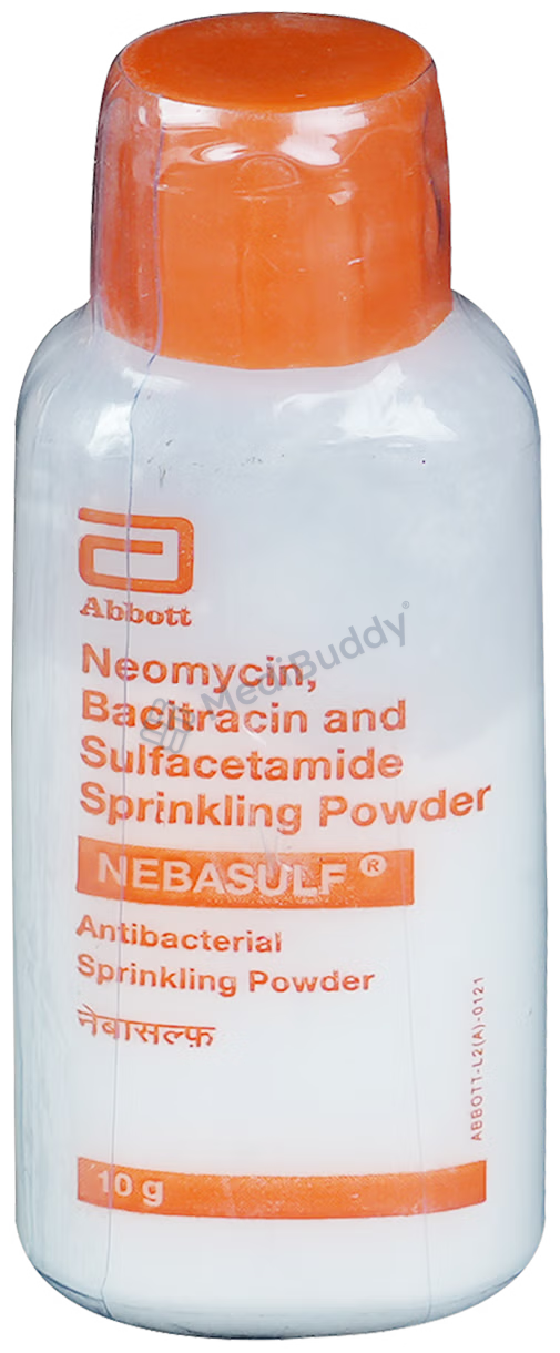 Before using Nebasulf Sprinkling Powder 10 gm, it is important to consider the following precautions to ensure safe and effective use. If you have allergies to Nebasulf Sprinkling Powder 10 gm or any other medications, consult your doctor before use, as it is meant for external application only. Avoid contact with the nose, ears, mouth, or eyes, but if accidental contact occurs, rinse thoroughly with water. Refrain from covering the treated area with dressings or bandages unless instructed by your doctor. Do not use Nebasulf Sprinkling Powder 10 gm on serious burns, deep wounds, or raw skin areas without medical guidance. Notify your doctor if you are pregnant, nursing, have lupus, or asthma before using this product. Using excessive amounts or extending the duration of use can heighten the risk of side effects and may lead to increased skin sensitivity. In case of accidental ingestion, seek immediate medical assistance.