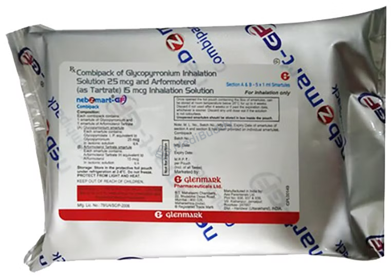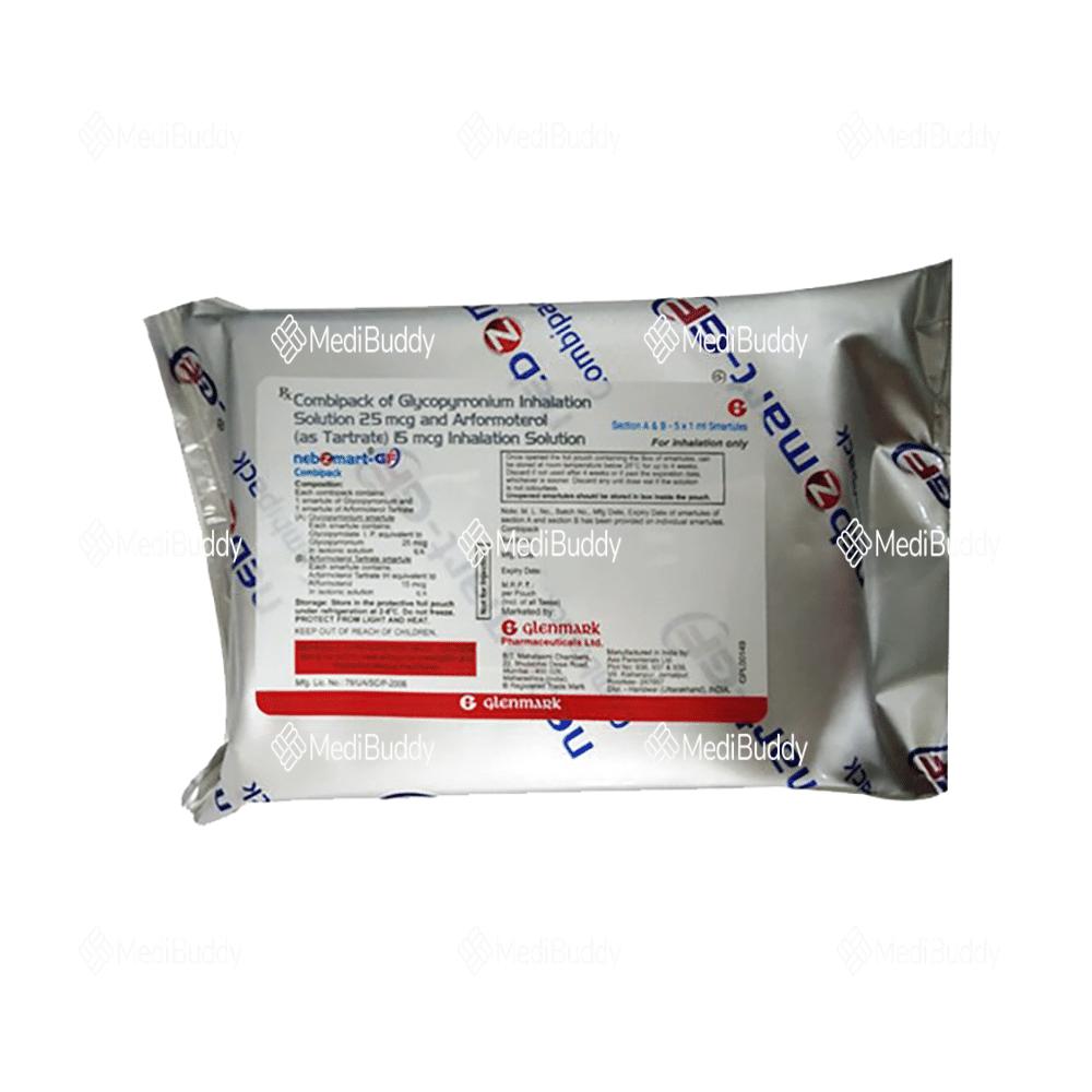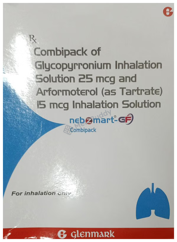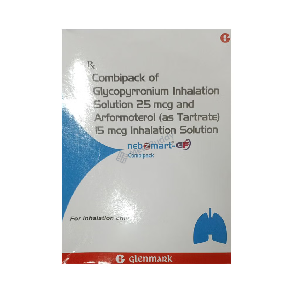NebzmartGF Combipack Smartule (1ml Each) is a beneficial medication for individuals suffering from Chronic Obstructive Pulmonary Disease (COPD). This combipack contains a combination of two effective medicines, Arformoterol and Glycopyrronium. Arformoterol, a longacting betaagonist, helps in keeping the airways in the lungs open by relaxing the muscles, which allows for easier airflow in and out of the lungs. On the other hand, Glycopyrronium, an anticholinergic agent, reduces secretions in the airways, further aiding in breathing. Together, these components work synergistically to provide relief from COPD symptoms.