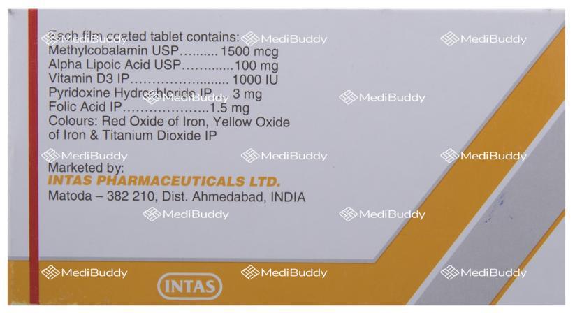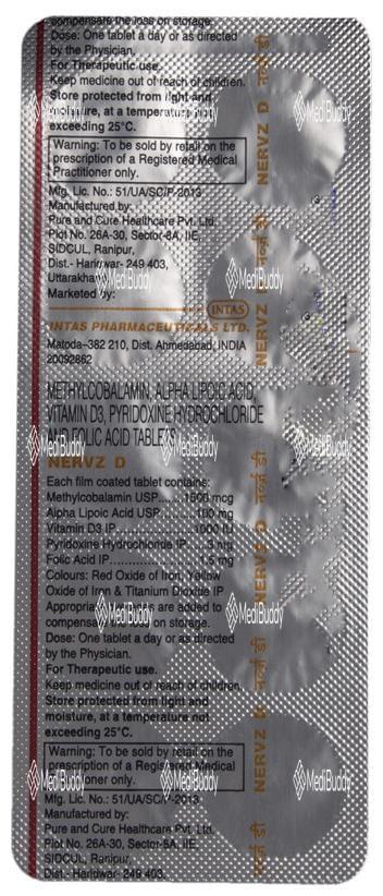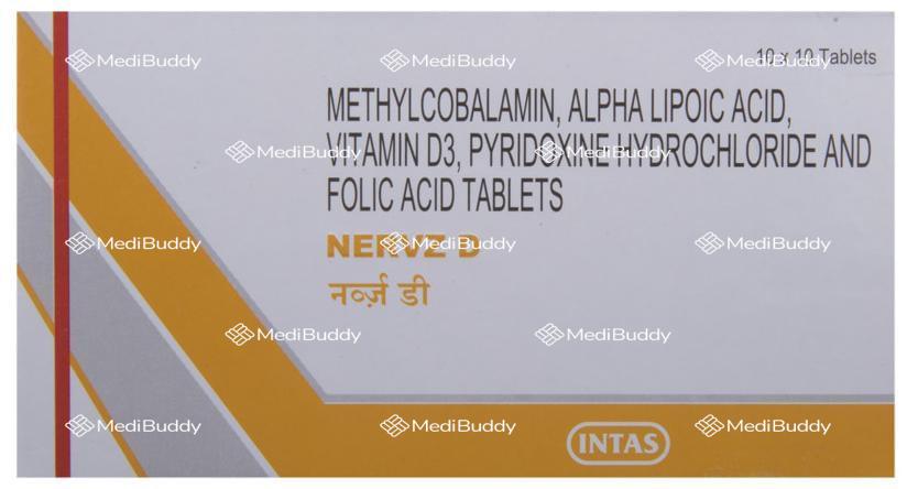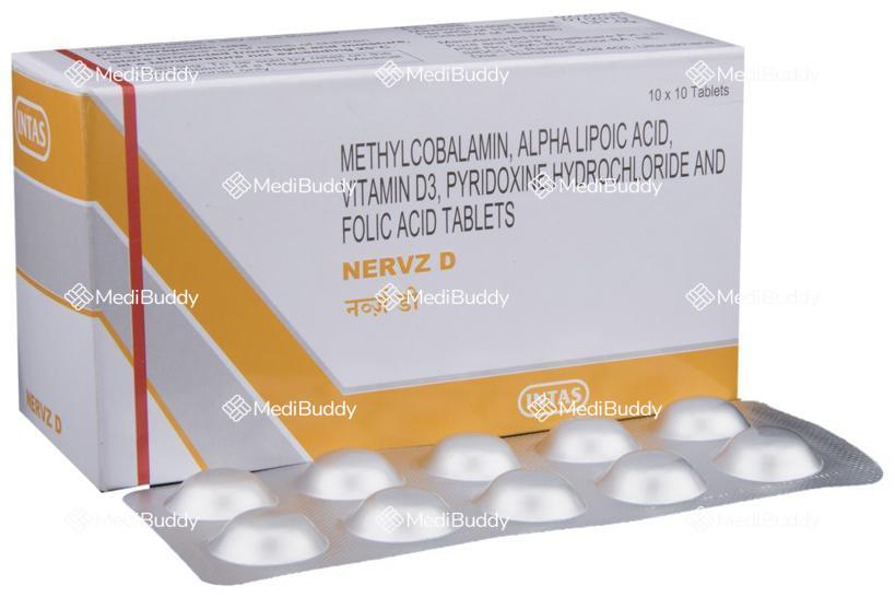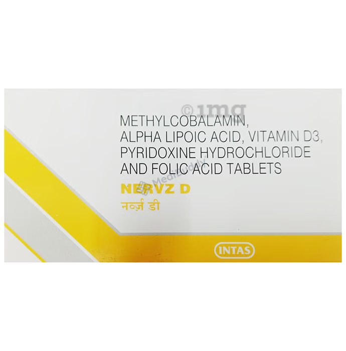 Nervz D Tablet is a vitamin supplement that serves as an adjuvant therapy, providing essential nutrients to support the normal functioning of the body systems and combat nutritional deficiencies. The tablet contains key ingredients such as Alpha lipoic acid, Folic acid, Methylcobalamin, Pyridoxine, and Vitamin D3, each playing a crucial role in maintaining overall health.