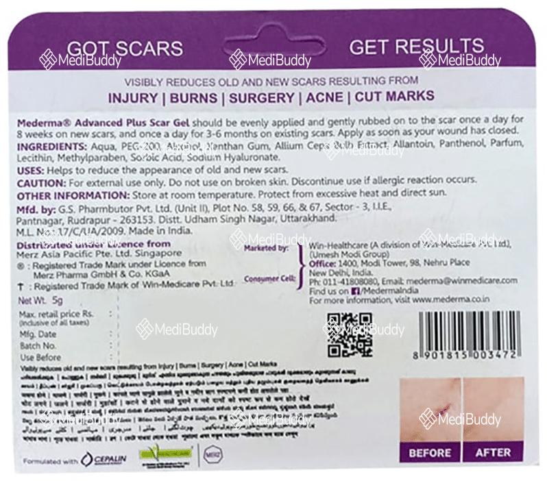 In addition to its scar-improving properties, Mederma Advanced Plus Gel also aids in enhancing the appearance and symptoms of wounds resulting from shave excisions of seborrheic keratoses. Its gel form makes it easy to apply, and the recommended dosage of 3-4 times a day or as directed by a healthcare professional ensures optimal results.