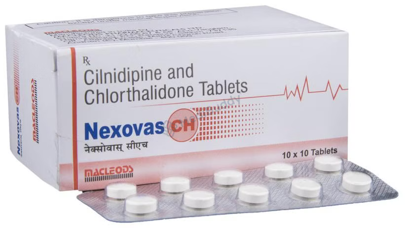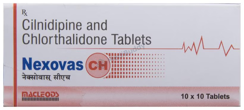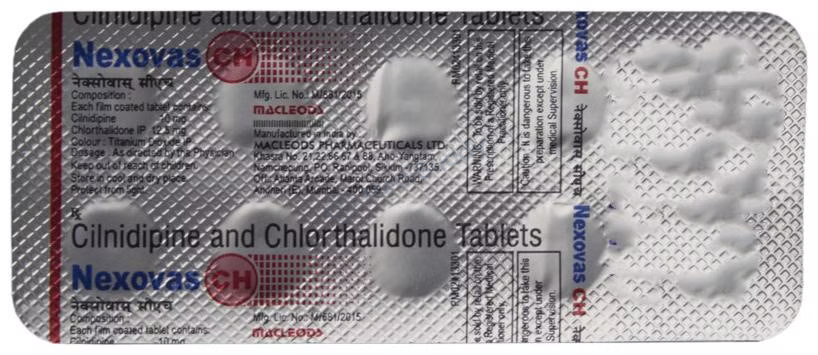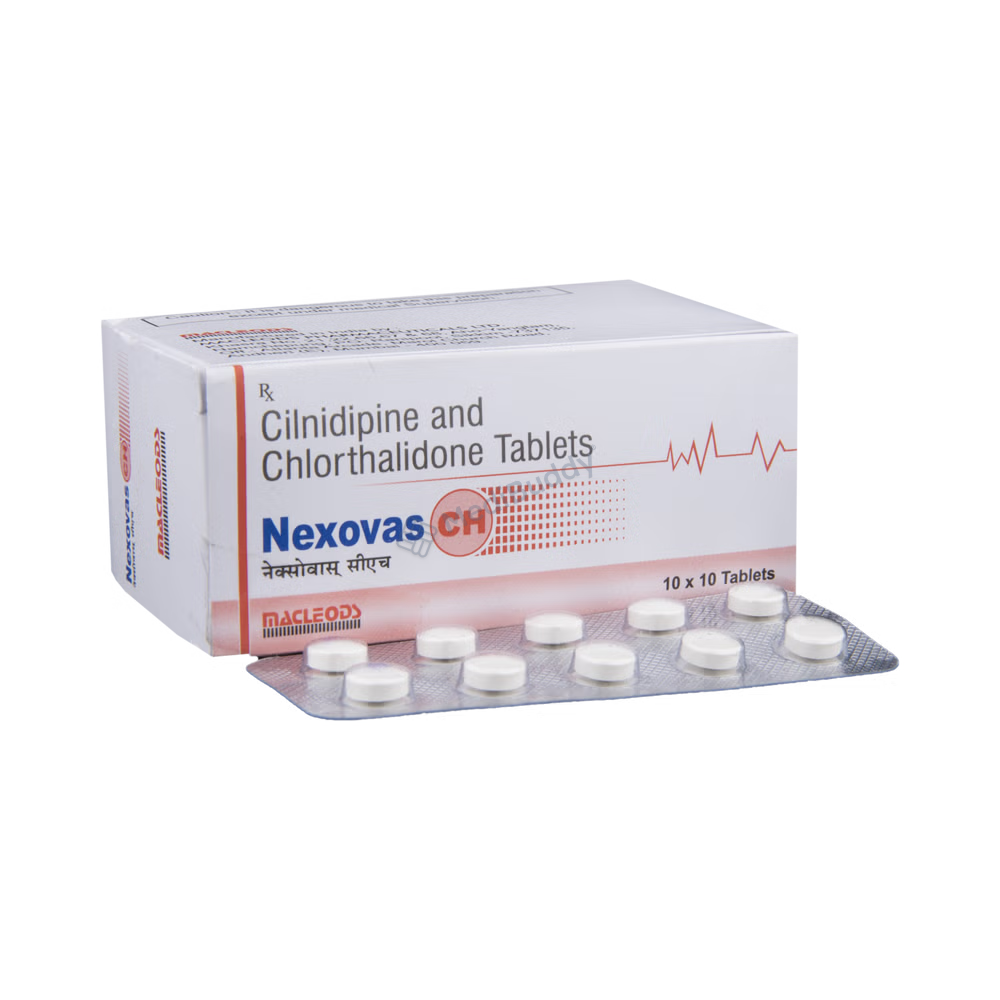 The key components of Nexovas CH Tablet are Cilnidipine and Chlorthalidone. Cilnidipine works by blocking calcium channels in the blood vessels of the heart, causing them to widen and reducing the pressure exerted by the blood on the vessel walls. This mechanism not only lowers the blood pressure but also lessens the workload on the heart, thereby decreasing the risk of cardiovascular events. On the other hand, Chlorthalidone acts as a diuretic, promoting the elimination of excess water and salts from the body through increased urination, which further helps in lowering blood pressure and reducing fluid retention associated with hypertension.