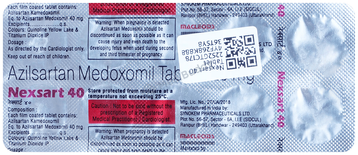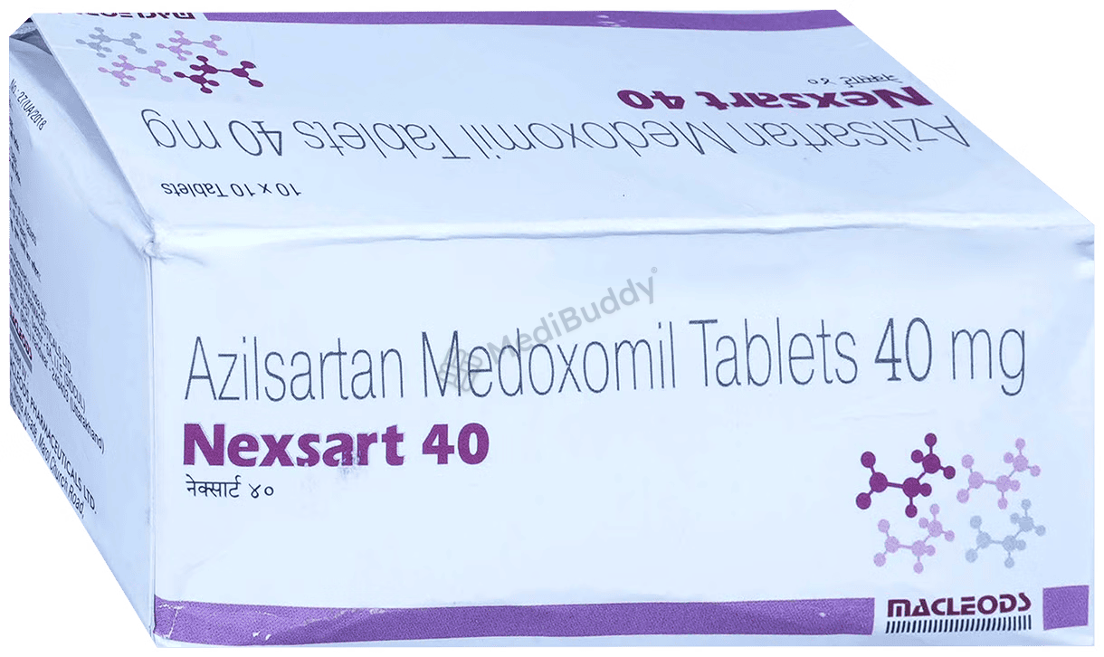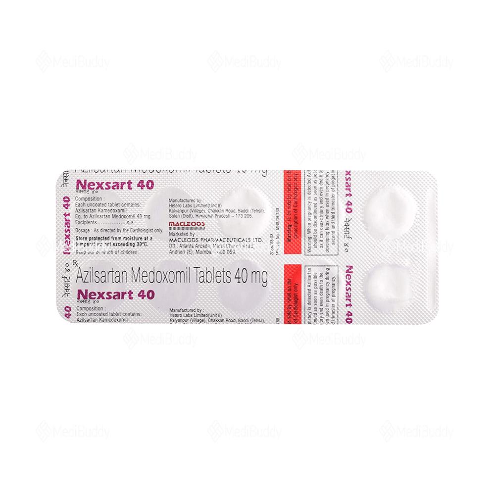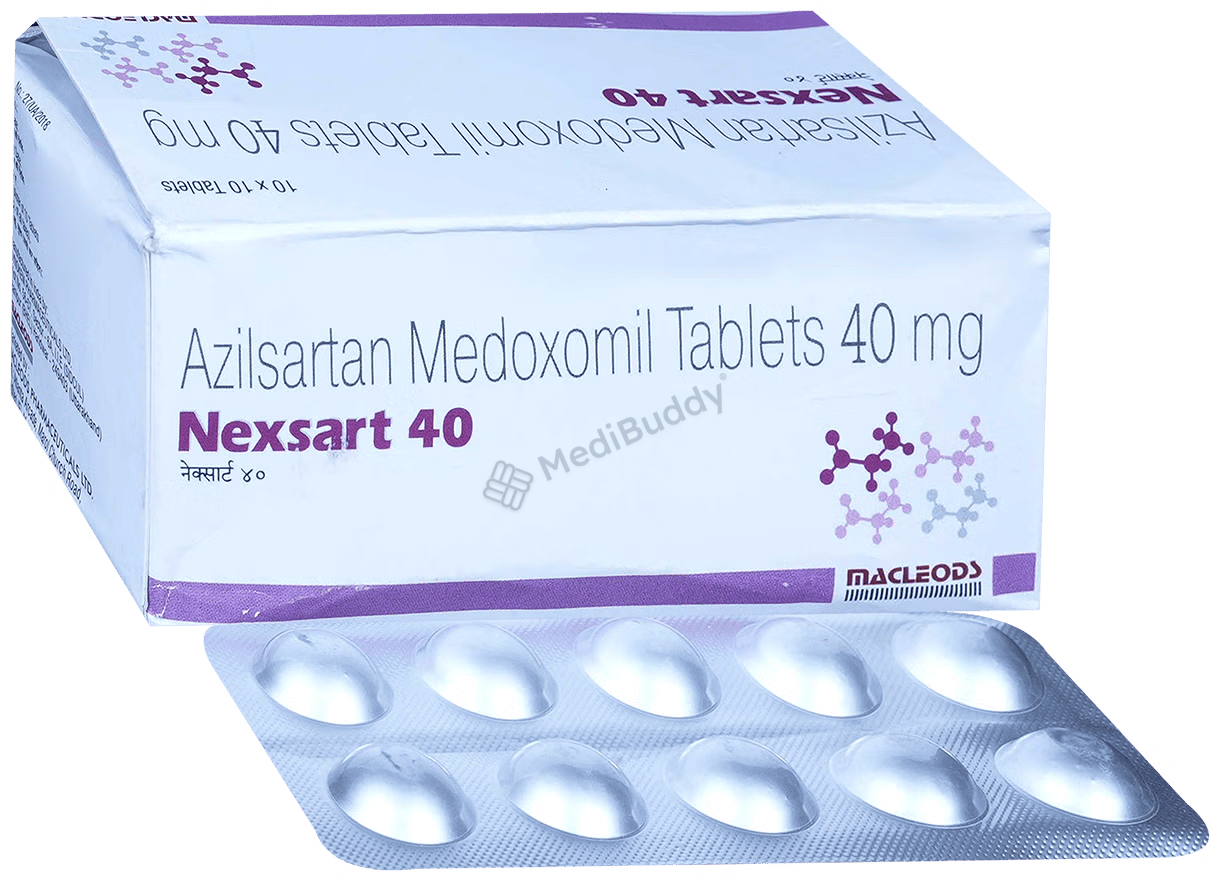 Nexsart 40 Tablet is a medication that is commonly prescribed to treat high blood pressure and heart failure. High blood pressure, if not managed properly, can increase the risk of serious heart-related conditions such as heart attack, stroke, and irregular heartbeat. Nexsart 40 Tablet contains 'Azilsartan medoxomil', which belongs to a group of medications known as angiotensin-II receptor antagonists. These medications work by narrowing and relaxing blood vessels to help lower blood pressure. By blocking angiotensin, the blood vessels widen, allowing for smoother blood flow.