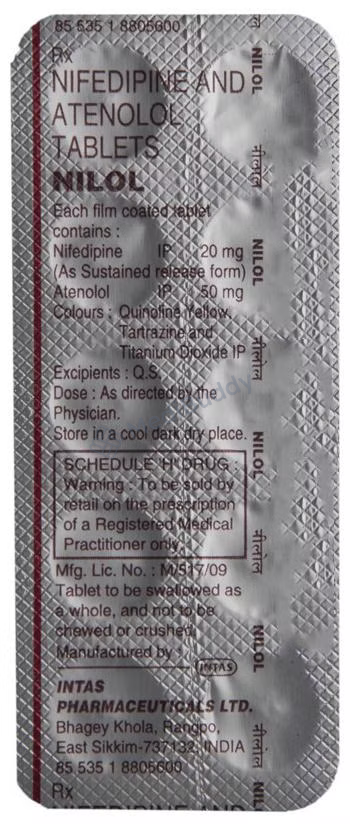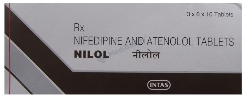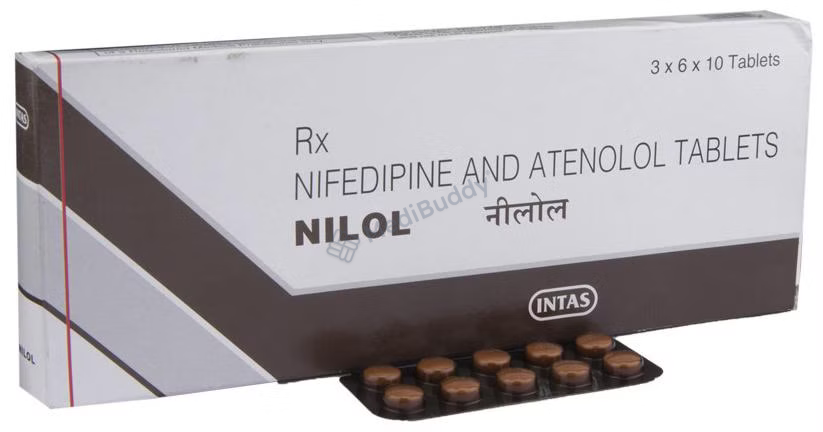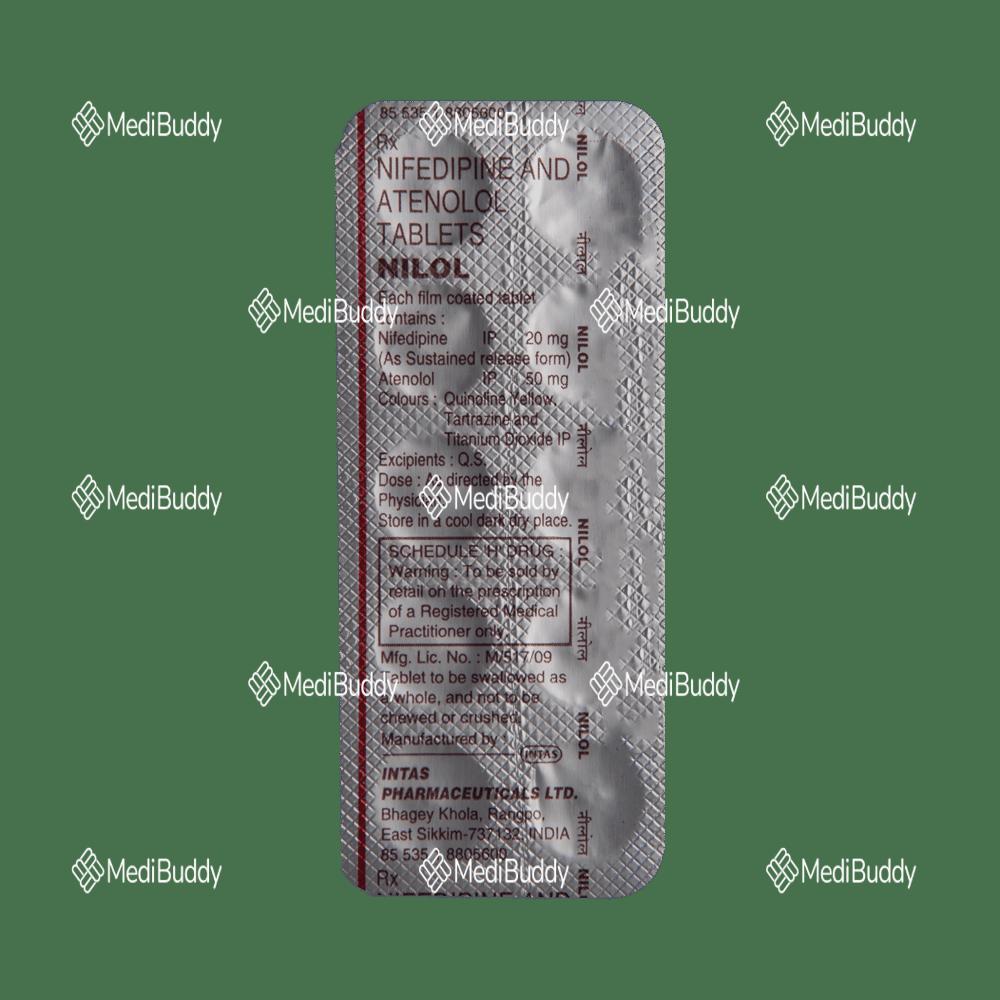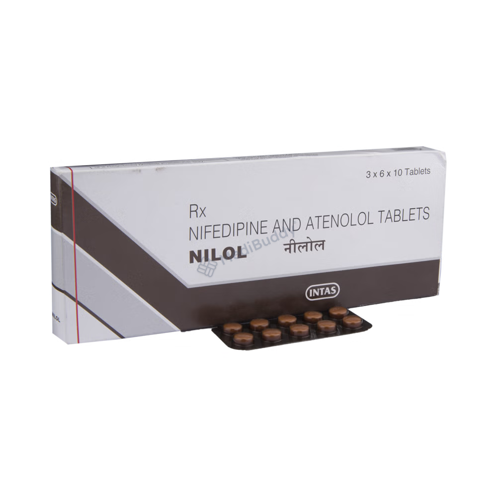 Nilol Tablet SR is a powerful medication designed to treat hypertension, also known as high blood pressure. This combination drug contains two active ingredients, Atenolol and Nifedipine, which work together to effectively lower blood pressure through different mechanisms. Atenolol, a beta-blocker, functions by blocking the release of stress hormones like adrenaline, which helps relieve symptoms such as angina (chest pain) and irregular heartbeats (arrhythmias). Additionally, Atenolol offers protection to the heart, especially during the treatment of a heart attack.