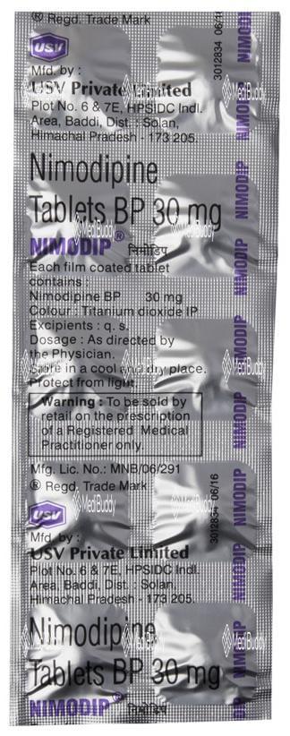 Nimodip Tablet is used to treat and prevent further brain damage following bleeding around the brain (subarachnoid hemorrhage - SAH). As a calcium channel blocker, it helps improve blood flow to the brain, preventing changes in brain function. It should be taken as prescribed by the doctor to maximize benefits. Common side effects may include decreased blood pressure, increased heart rate, headache, stomach discomfort, nausea, rash, muscle cramp, and edema. It's important to notify your doctor of any heart or liver issues and other medications you are taking. Pregnant or breastfeeding women should seek medical advice before using this medicine.