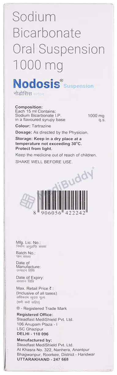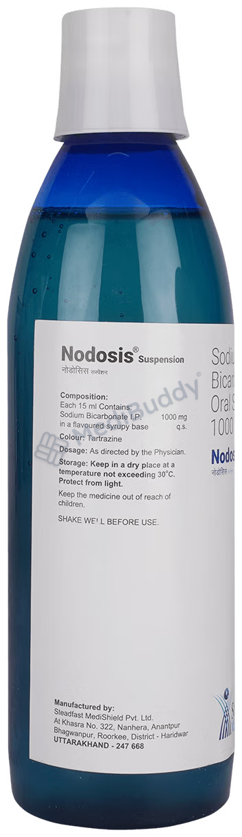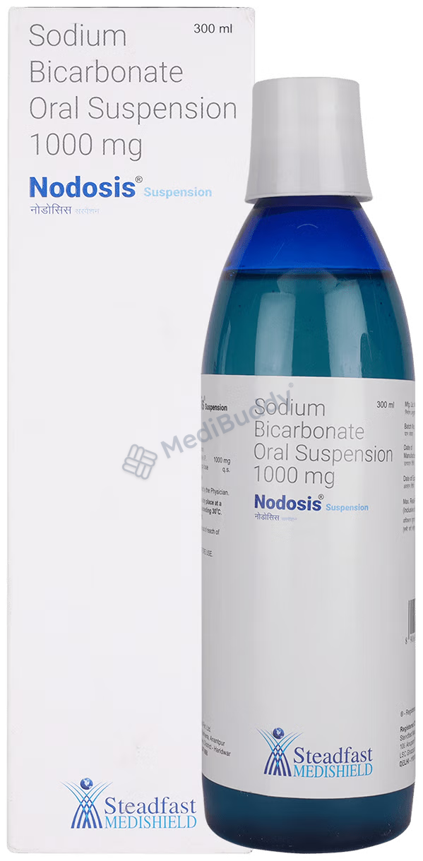 Similarly, Nodosis 1000mg Suspension is an antacid utilized for treating heartburn, indigestion, and upset stomach, featuring Sodium Bicarbonate to neutralize stomach acid. This active ingredient raises plasma bicarbonate levels, decreases excessive hydrogen ion concentrations, normalizes blood pH levels, and alleviates clinical symptoms of acidosis. Always adhere to the instructions provided by your physician when using Nodosis 1000mg Suspension and ensure to keep within the recommended dosage limits.
