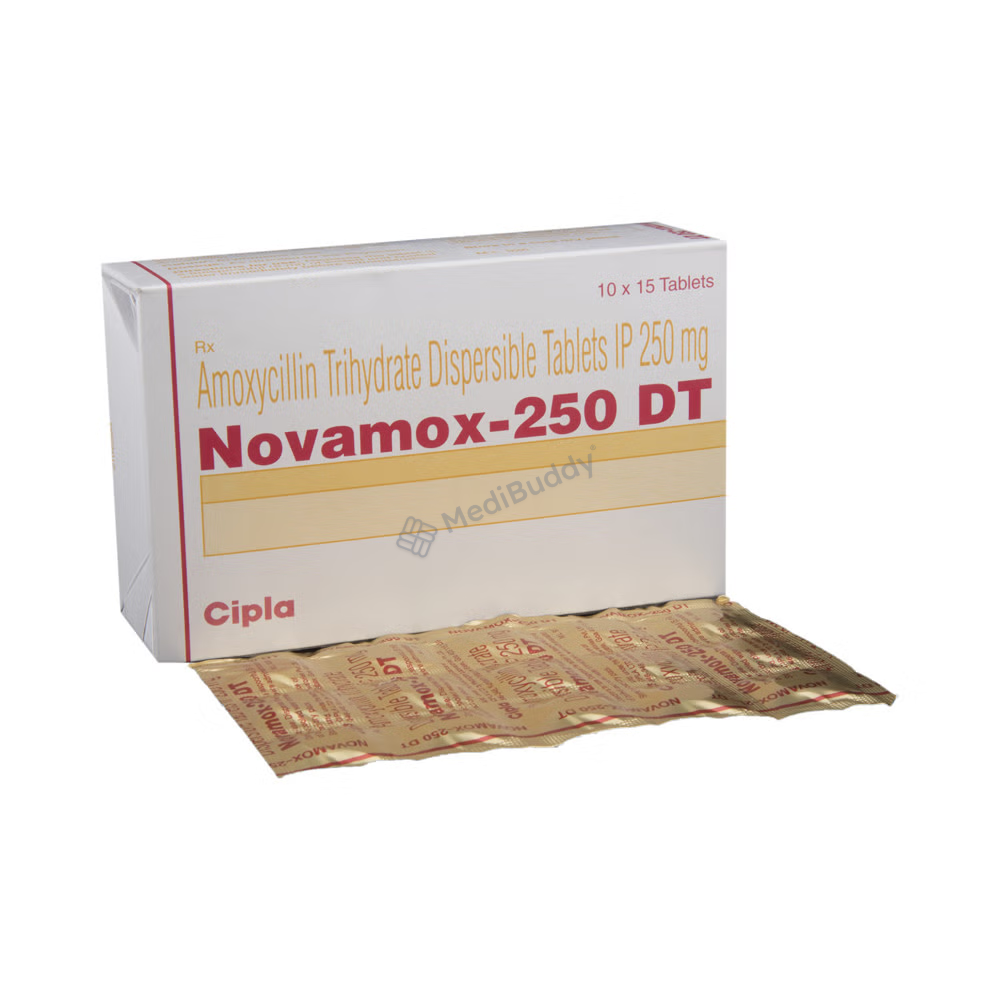 Novamox 250 DT Tablet is a medication used to treat various bacterial infections affecting different parts of the body such as the throat, ear, nasal sinuses, respiratory tract, urinary tract, skin, and soft tissue. It is also effective in combating typhoid fever. In addition to treating infections, Novamox 250 DT Tablet can help eradicate H. pylori bacteria in individuals with peptic ulcer disease. This medicine falls under the category of broad-spectrum antibiotics, meaning it fights against and inhibits the growth of many types of bacteria. To minimize the risk of stomach upset, it is recommended to take Novamox 250 DT Tablet with a meal.