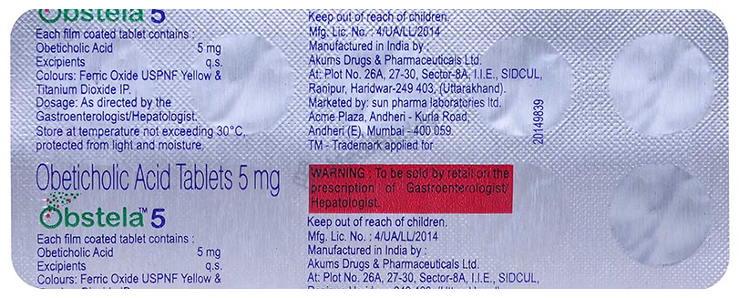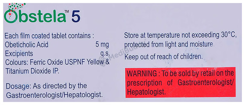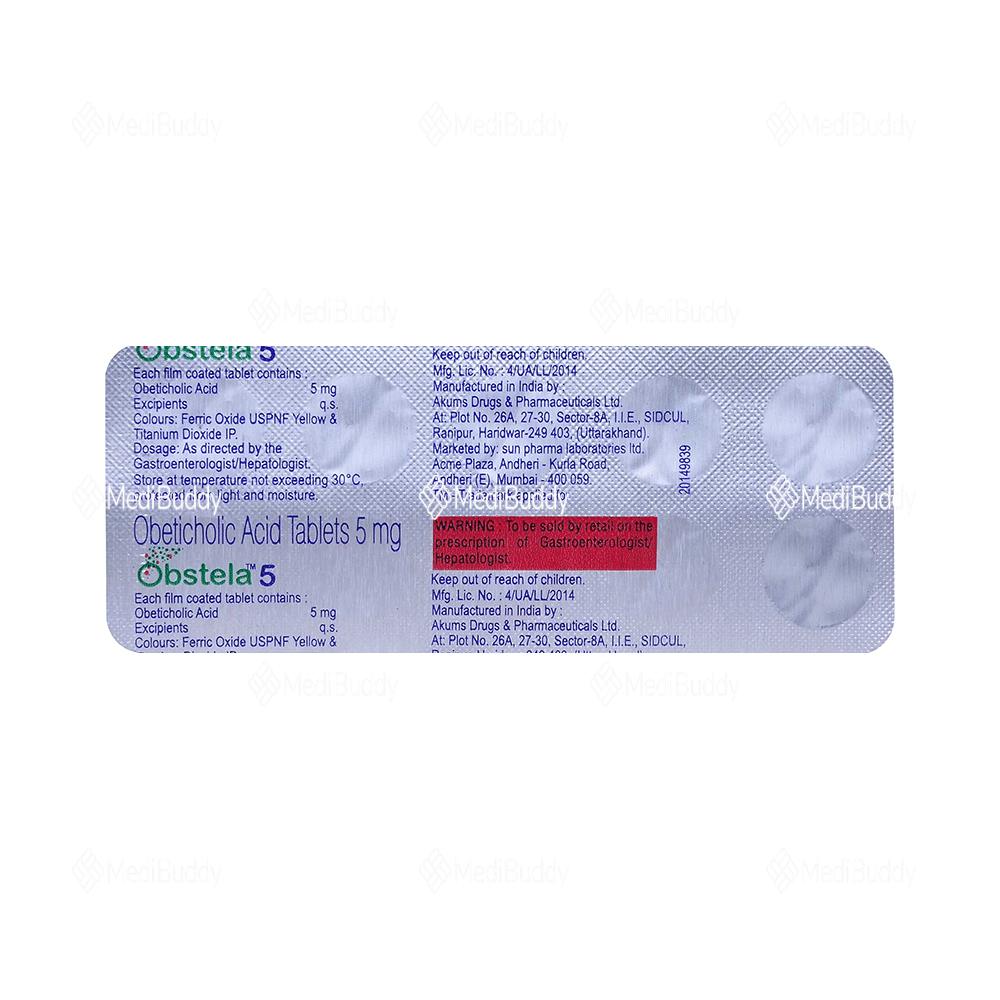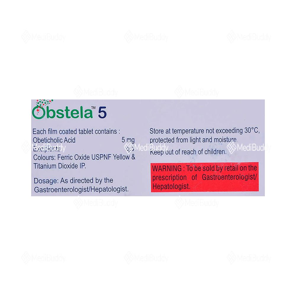 Obstela 5mg Tablet, also known as Obstela 5 Tablet 10's, is a medication used in the treatment of primary biliary cirrhosis. This condition, also referred to as primary biliary cholangitis, is an autoimmune disease that causes damage to the bile ducts in the liver. This damage results in a build-up of bile in the liver, leading to liver damage. Obstela 5 Tablet 10's belongs to a group of medications known as Farnesoid X-receptor agonists, and its active ingredient is Obeticholic acid.