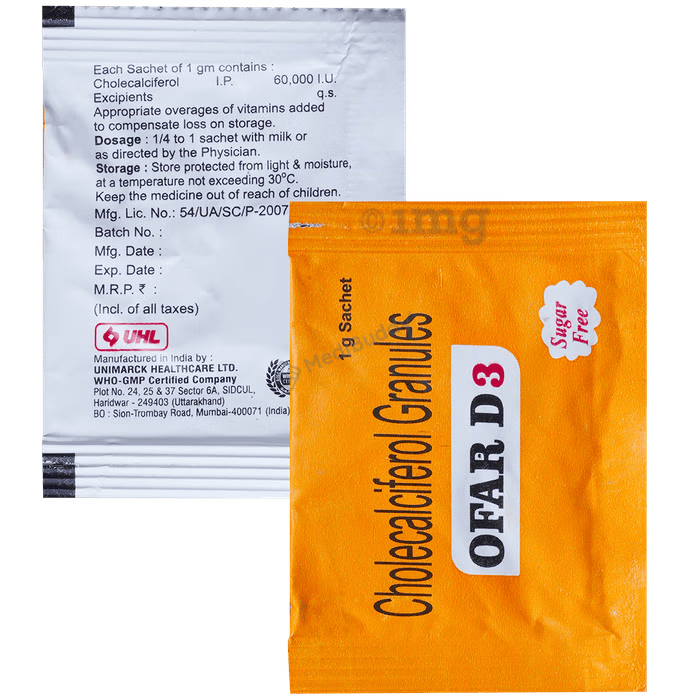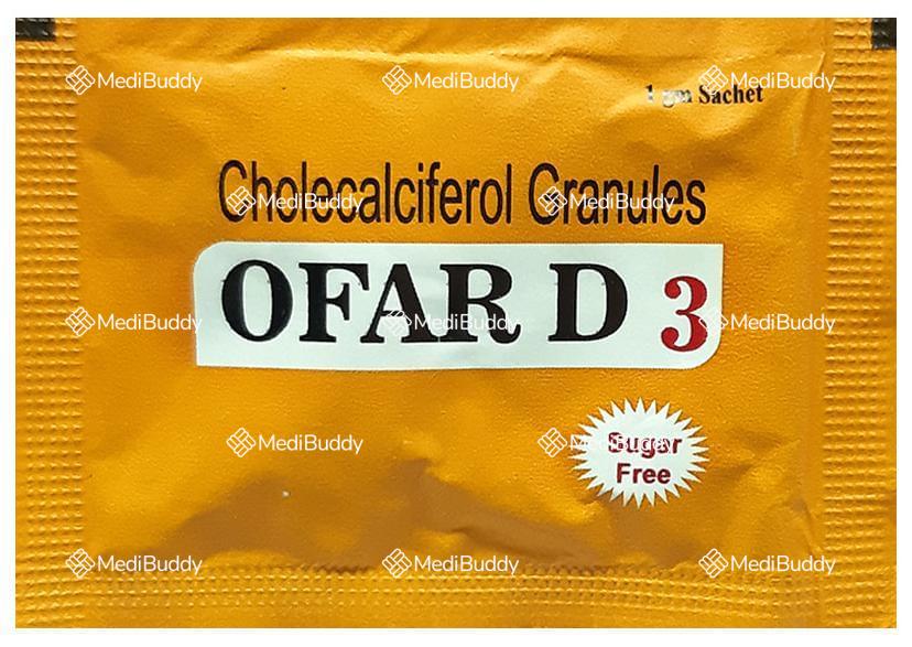 Ofar D3 Granules Sugar-Free is a dietary supplement that contains Cholecalciferol, also known as Vitamin D3. This supplement is specifically formulated to promote bone, teeth, and joint health. Cholecalciferol is a key ingredient that is utilized to manage vitamin D deficiency and is often combined with calcium to help maintain bone strength.