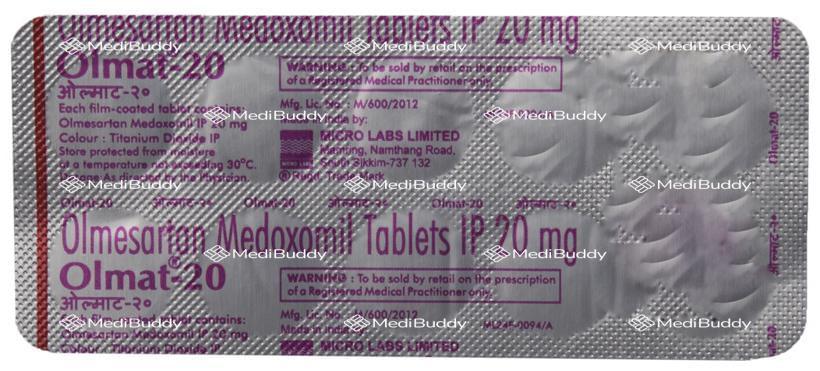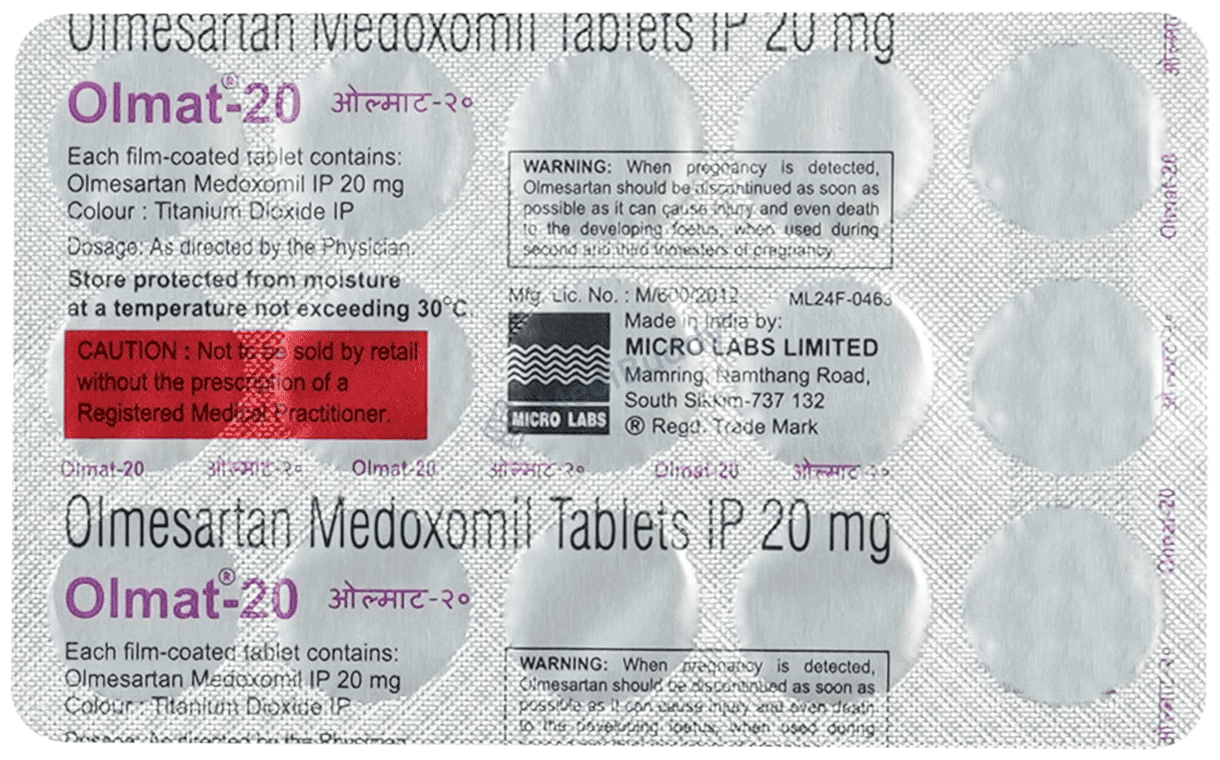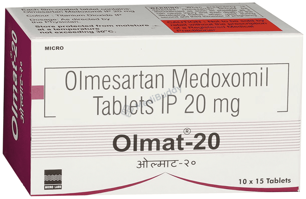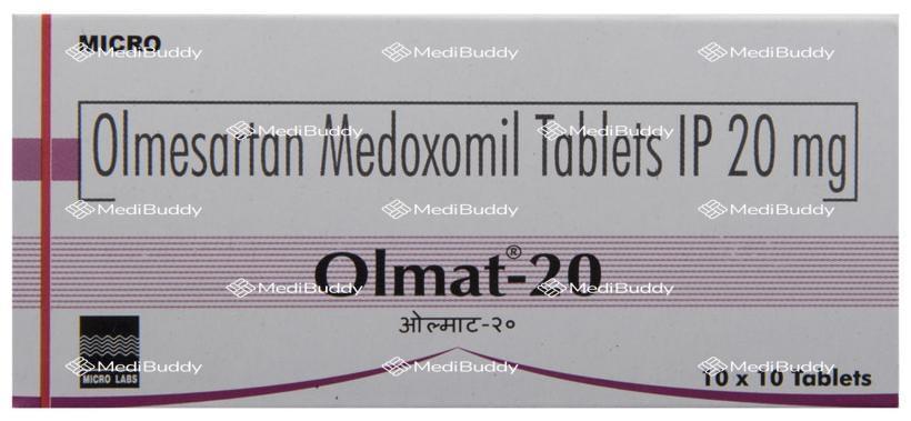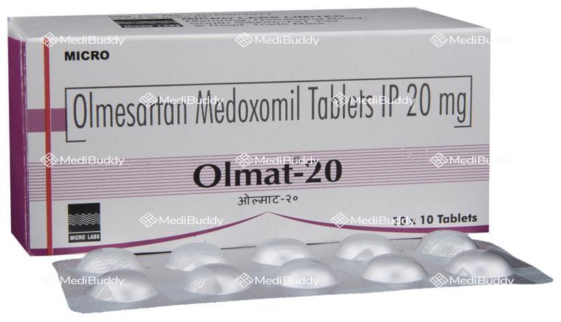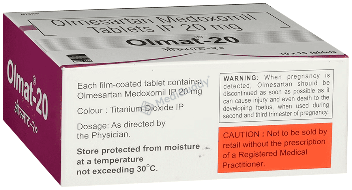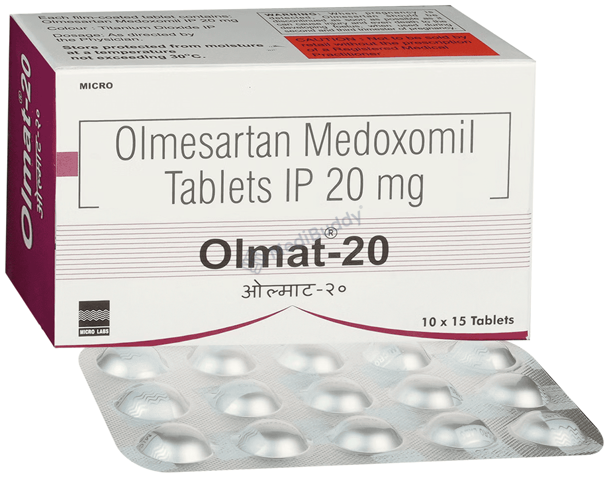 Olmat 20 Tablet is used to treat hypertension, or high blood pressure. Lowering blood pressure helps prevent heart attacks and strokes and preserves kidney function in diabetic patients. It must be taken regularly, even if you feel well, to maintain control. Lifestyle changes like exercise, weight loss, and dietary adjustments are beneficial. Side effects can include dizziness, cough, diarrhea, and more. Inform your doctor if these persist. Prior medical conditions like kidney or liver issues should be discussed before starting this medicine. Pregnant or nursing women should avoid it. Regular monitoring by your doctor is advisable.