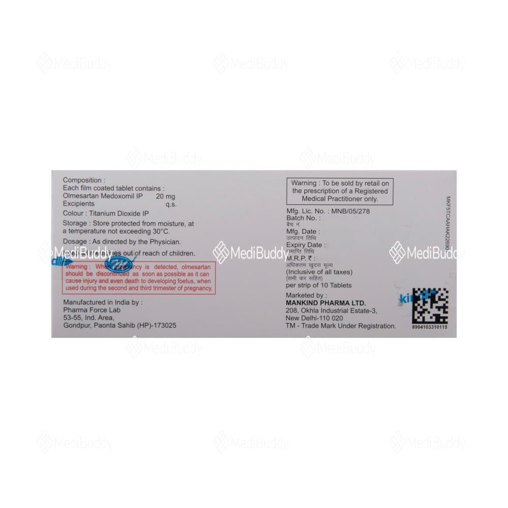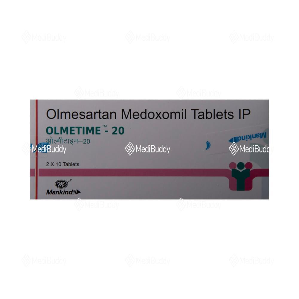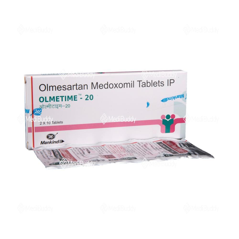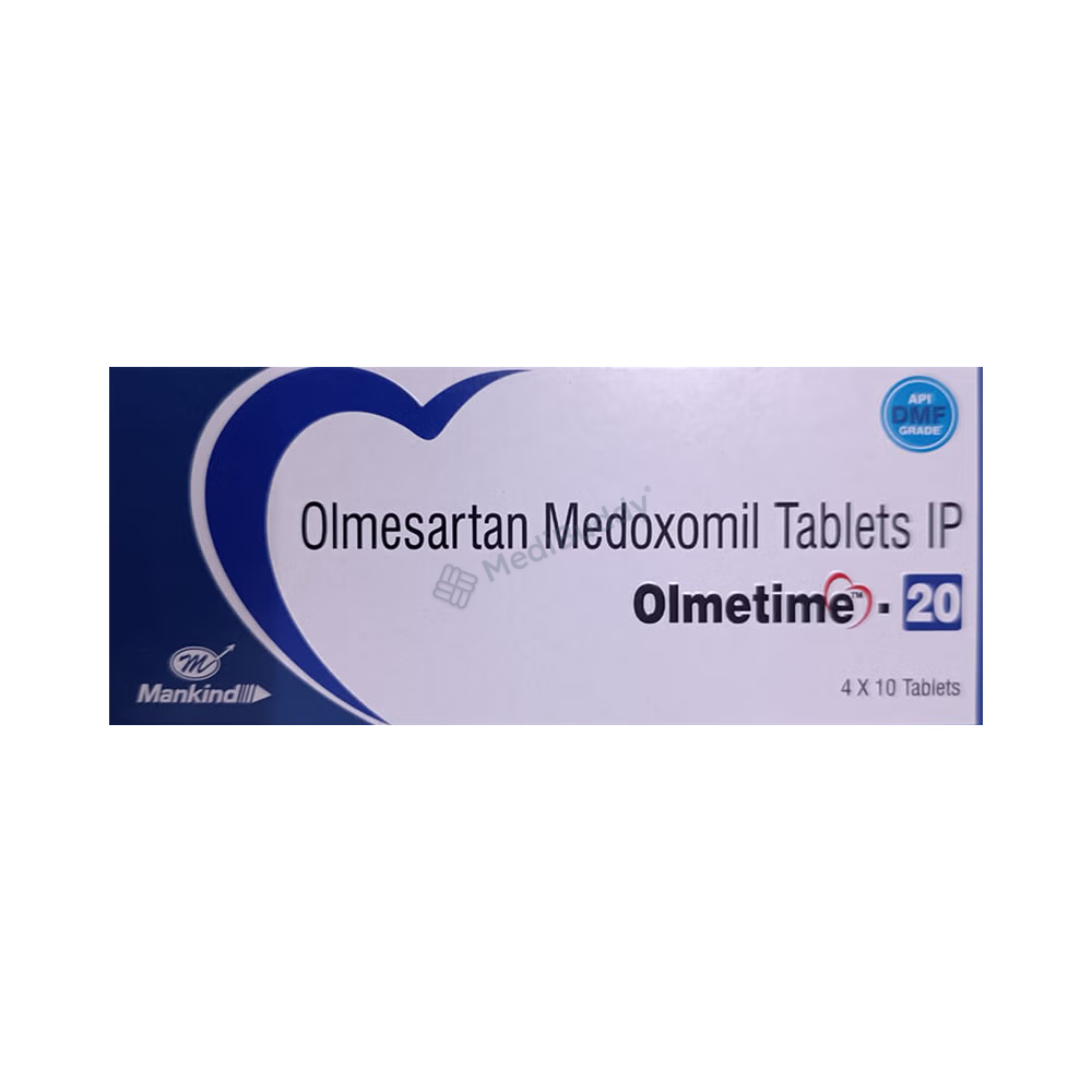 Olmetime 20 Tablet is used to treat hypertension, or high blood pressure. Lowering blood pressure helps prevent heart attacks and strokes and preserves kidney function in diabetic patients. It must be taken regularly, even if you feel well, to maintain control. Lifestyle changes like exercise, weight loss, and dietary adjustments are beneficial. Side effects can include dizziness, cough, diarrhea, and more. Inform your doctor if these persist. Prior medical conditions like kidney or liver issues should be discussed before starting this medicine. Pregnant or nursing women should avoid it. Regular monitoring by your doctor is advisable.