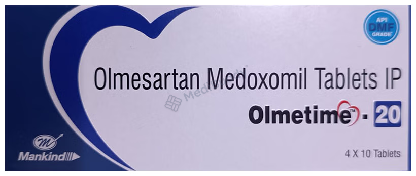 Olmetime 20 Tablet is a medication used to treat hypertension, which is a condition characterized by persistently elevated blood pressure levels. By lowering blood pressure, this medicine helps prevent potential heart attacks and strokes. Additionally, it is beneficial in preserving kidney function in individuals with diabetes. This medication, containing 'Olmesartan medoxomil,' belongs to a class of drugs known as angiotensin-II receptor blockers (ARBs). It works by narrowing blood vessels to increase blood pressure, and blocking angiotensin results in widening the narrowed blood vessels, facilitating smoother blood flow.