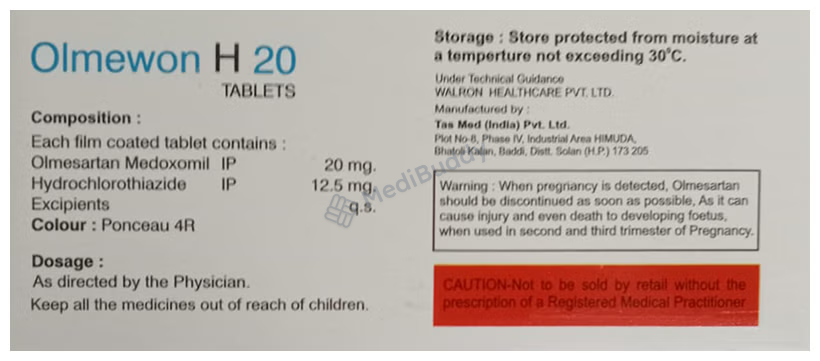 It is important to note that Olmewon H 20 Tablet is not recommended during pregnancy or while breastfeeding. Before taking this medication, consult your doctor if you have kidney or liver disease, heart issues, or diabetes. Additionally, consuming alcohol while on this medication can further lower your blood pressure and may enhance potential side effects.
