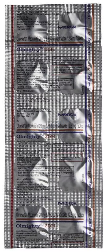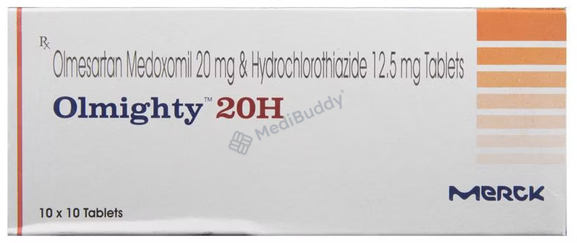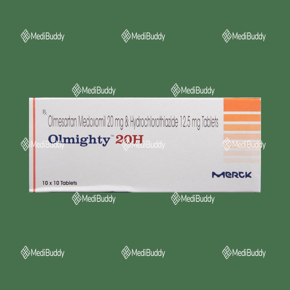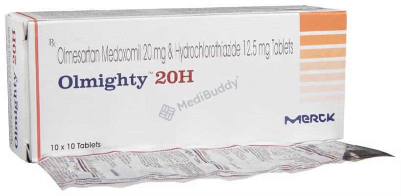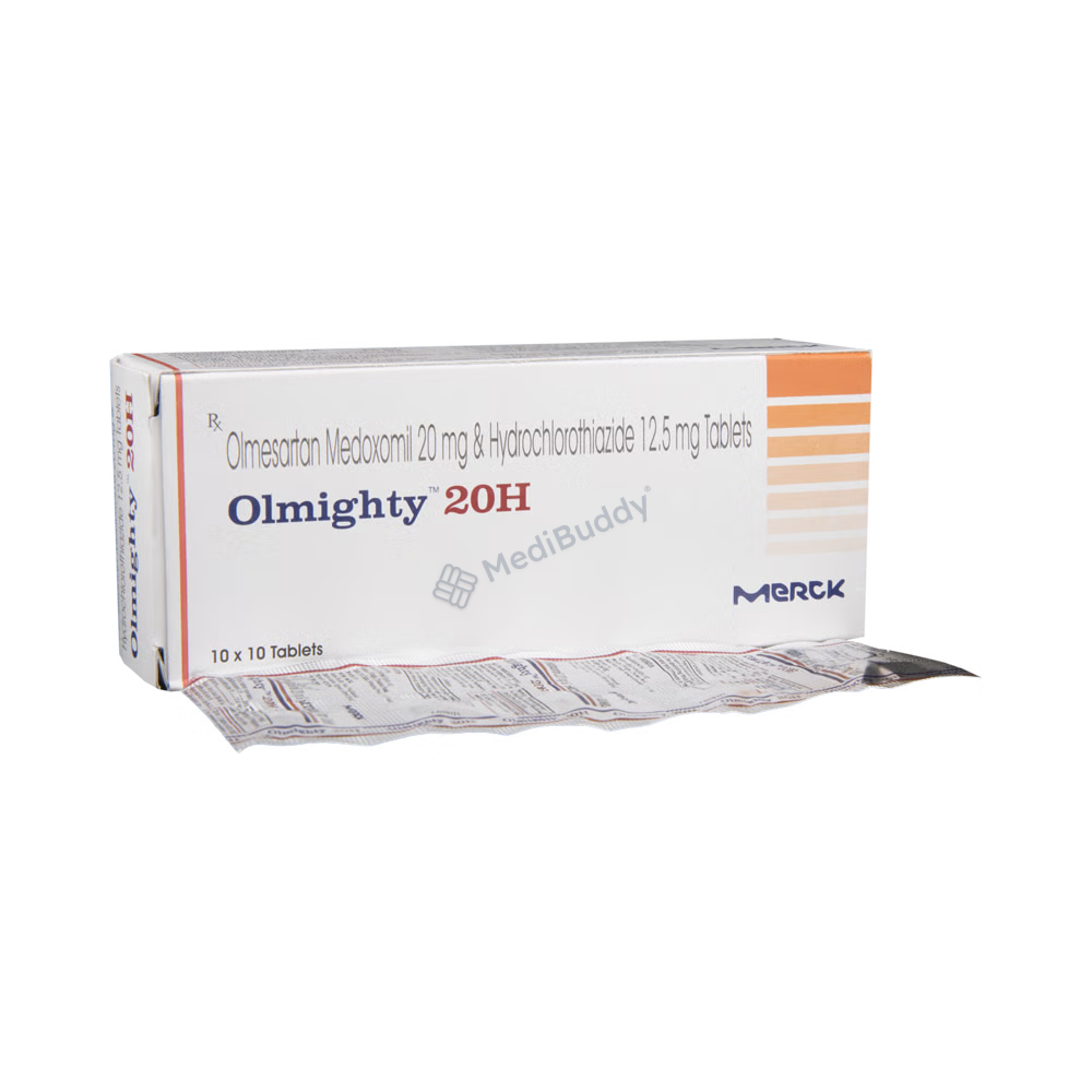 Olmighty 20 H Tablet is a medication used for controlling high blood pressure, a condition that can lead to serious health issues like heart attacks, strokes, and kidney failure if left untreated. This tablet contains two active ingredients, Olmesartan medoximil and Hydrochlorothiazide. Olmesartan medoximil is an angiotensin receptor blocker that relaxes and widens blood vessels, allowing for smoother blood flow and more efficient heart function. Hydrochlorothiazide, on the other hand, is a diuretic that helps remove excess fluid and electrolytes from the body. Together, these components work to lower blood pressure, improve blood flow, and reduce the risk of heart-related diseases.