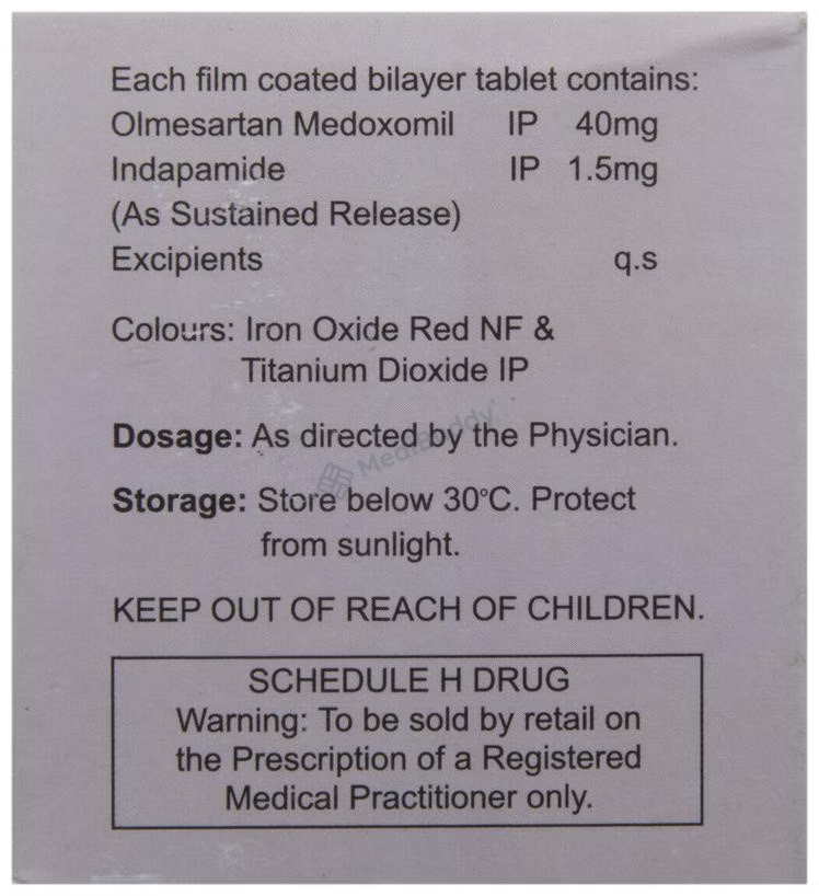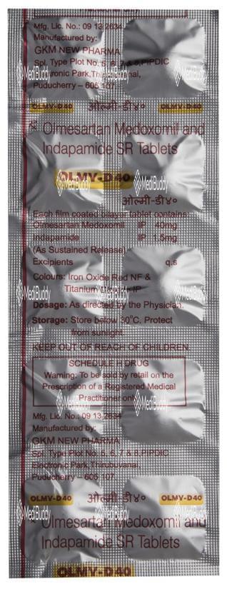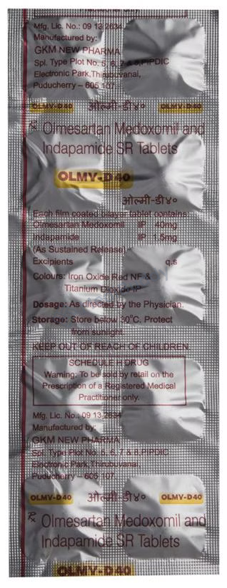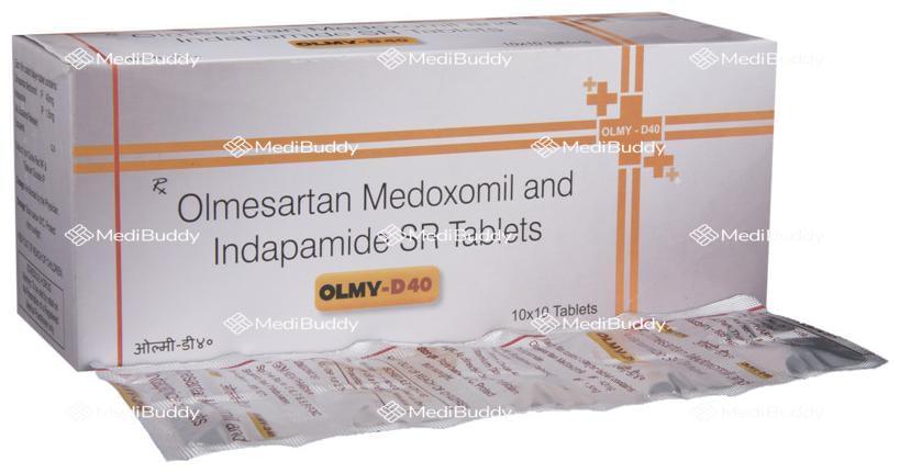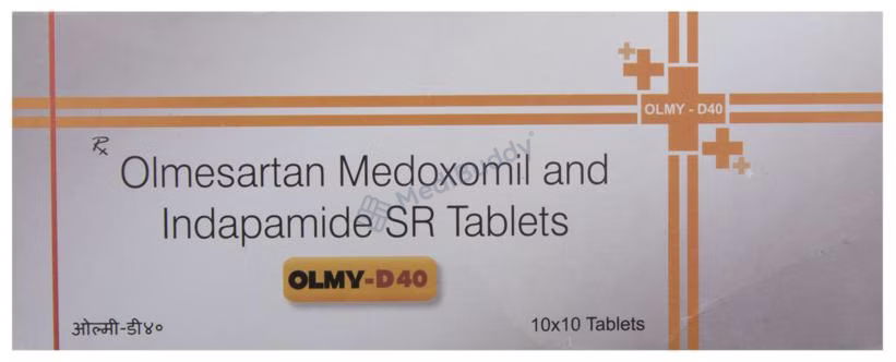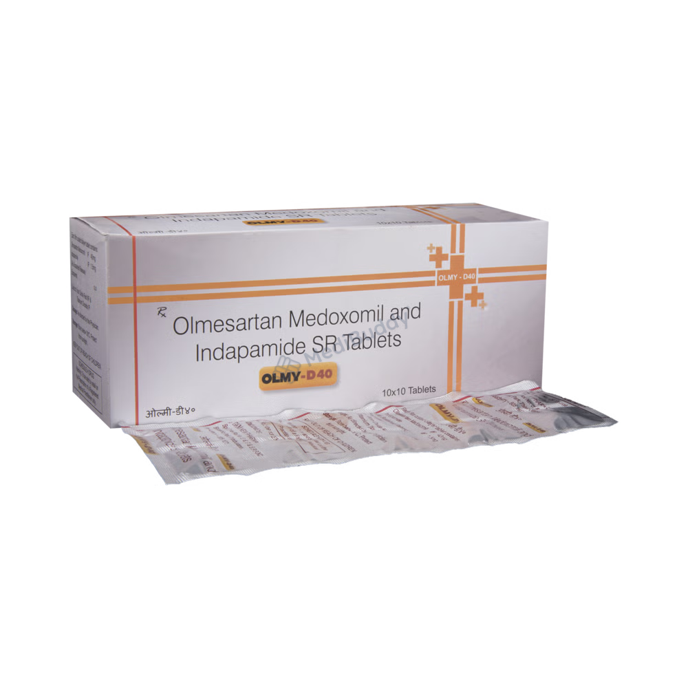 Olmy-D 40 Tablet SR is a combination of Olmesartan Medoxomil and Indapamide. Olmesartan Medoxomil acts as an angiotensin receptor blocker, relaxing blood vessels and improving blood flow, while Indapamide is a diuretic that helps in removing excess water and electrolytes from the body, thereby reducing fluid overload and lowering blood pressure. It is essential to inform your doctor if you are pregnant or have conditions like kidney or liver disease, heart issues, or diabetes before taking this medication. Additionally, consulting your healthcare provider if you are allergic to the medication or if you are taking other medicines is essential.