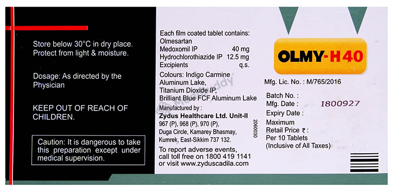 Olmy-H 40 Tablet should be taken as per your doctor's instructions, with or without food and a glass of water. It is essential to take the medication regularly at the same time each day for optimal benefits, even if you feel well, as high blood pressure often presents no symptoms.