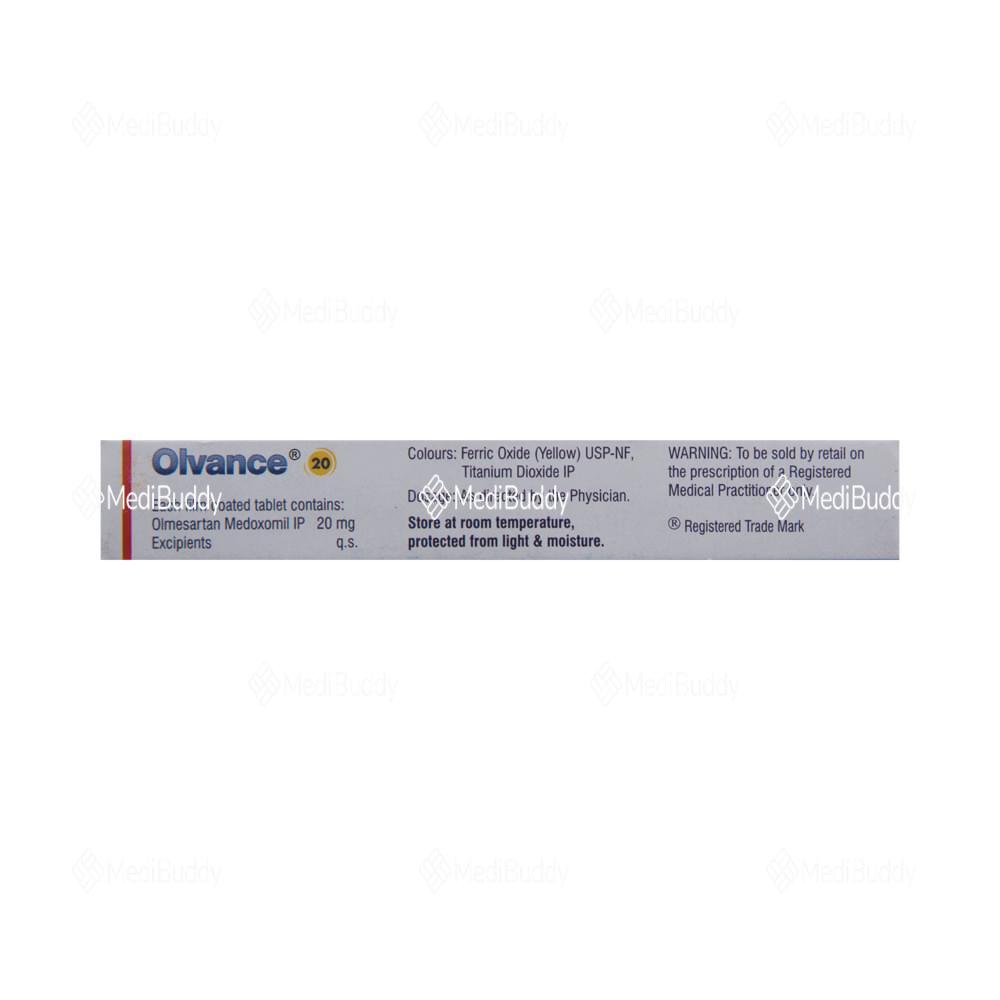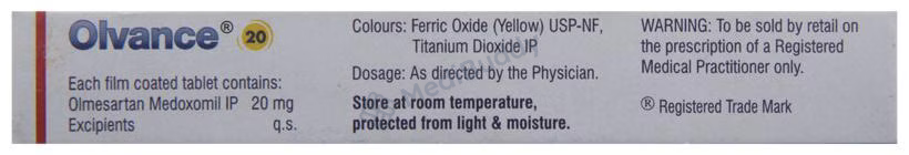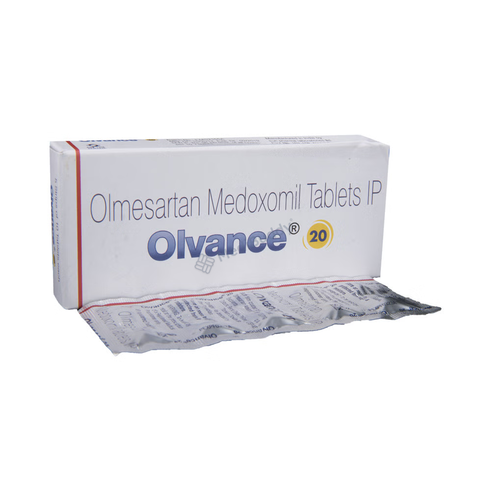 Olvance 20 Tablet is used to treat hypertension, or high blood pressure. Lowering blood pressure helps prevent heart attacks and strokes and preserves kidney function in diabetic patients. It must be taken regularly, even if you feel well, to maintain control. Lifestyle changes like exercise, weight loss, and dietary adjustments are beneficial. Side effects can include dizziness, cough, diarrhea, and more. Inform your doctor if these persist. Prior medical conditions like kidney or liver issues should be discussed before starting this medicine. Pregnant or nursing women should avoid it. Regular monitoring by your doctor is advisable.