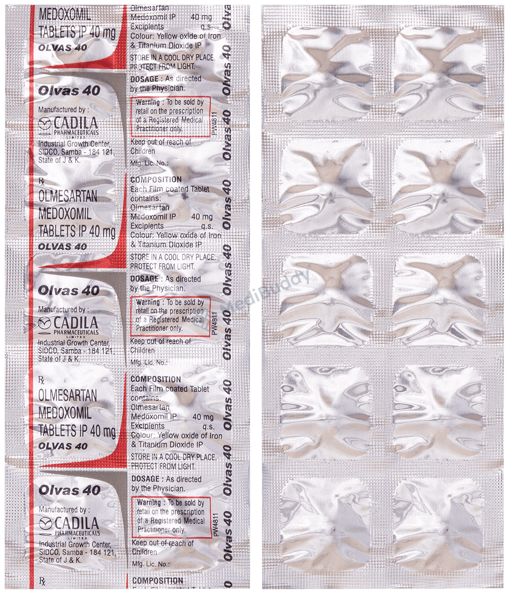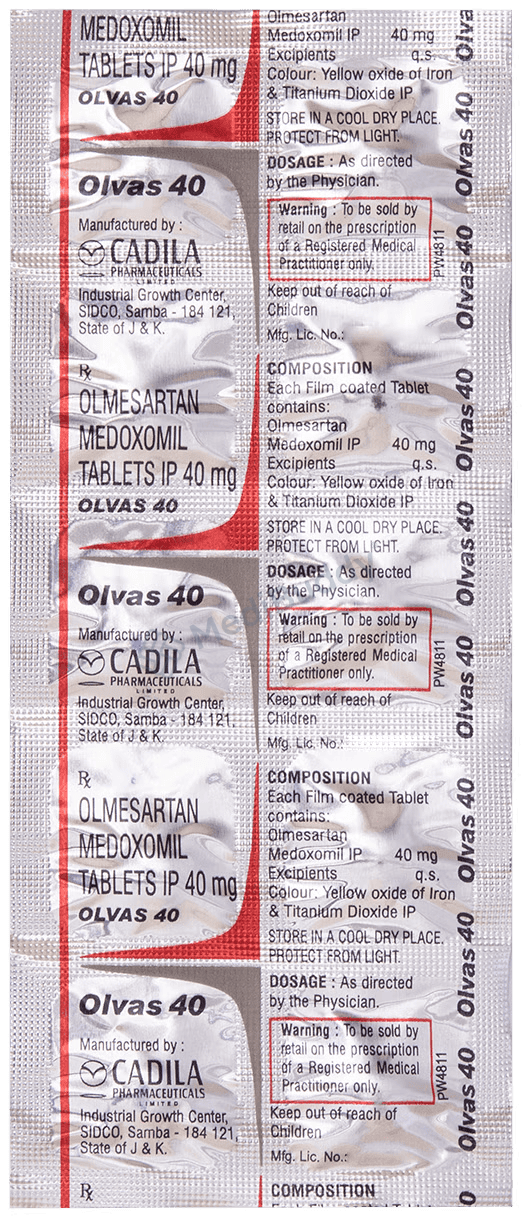 Olvas 40 Tablet is prescribed for hypertension, which is high blood pressure. It helps lower blood pressure to prevent heart attacks and strokes. This medicine can also maintain kidney function in diabetes patients. It is important to take Olvas 40 Tablet regularly, even if you feel fine, as high blood pressure often has no symptoms. Lifestyle changes like exercise, weight loss, and following doctor’s advice on diet can complement the medicine. Some people may experience minor side effects initially, but they usually improve over time. Prior medical conditions like kidney or liver issues should be disclosed to the doctor before starting this medication. It is not recommended for use by pregnant or breastfeeding women. Regular monitoring of kidney function, blood pressure, and potassium levels is advised while on this treatment.