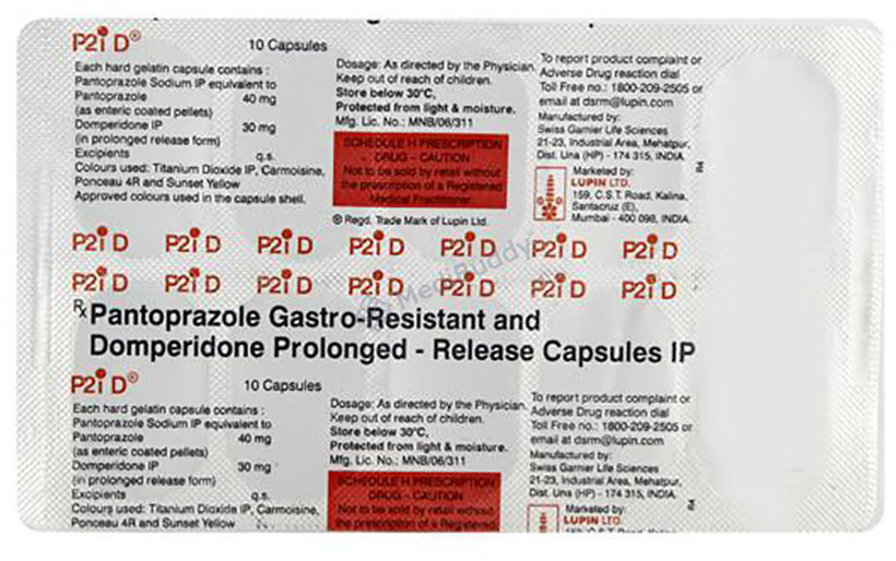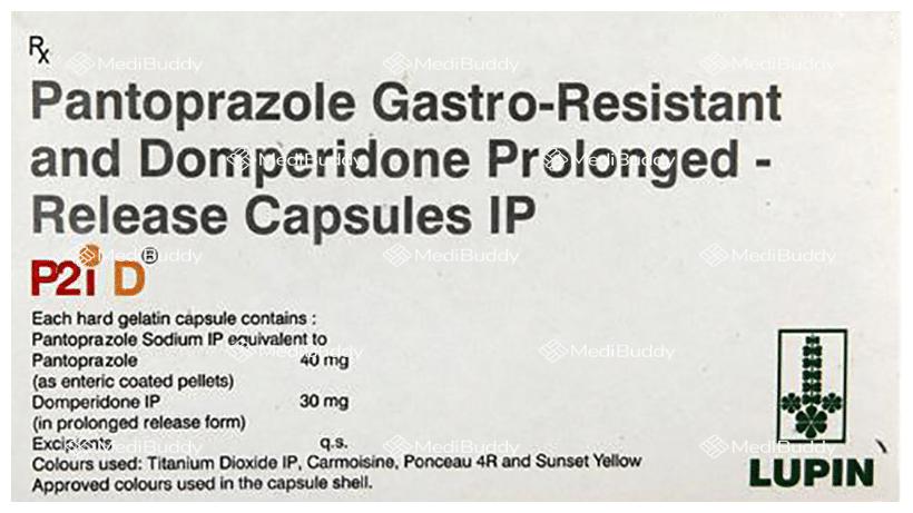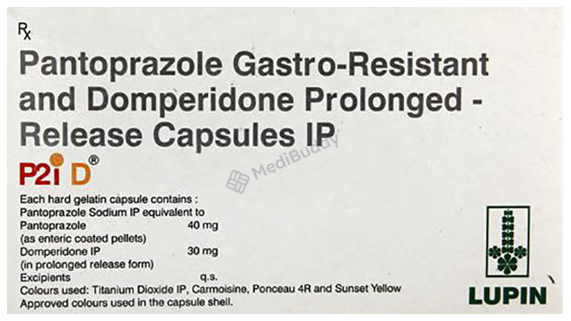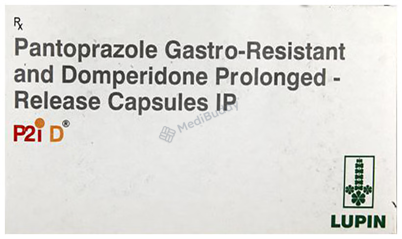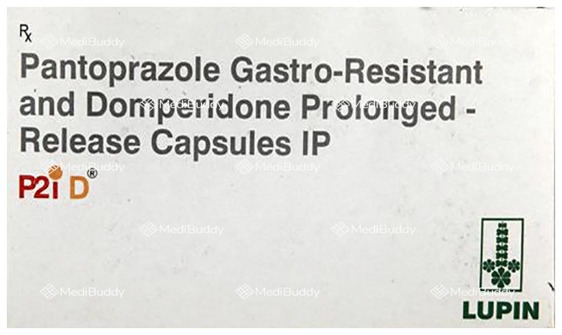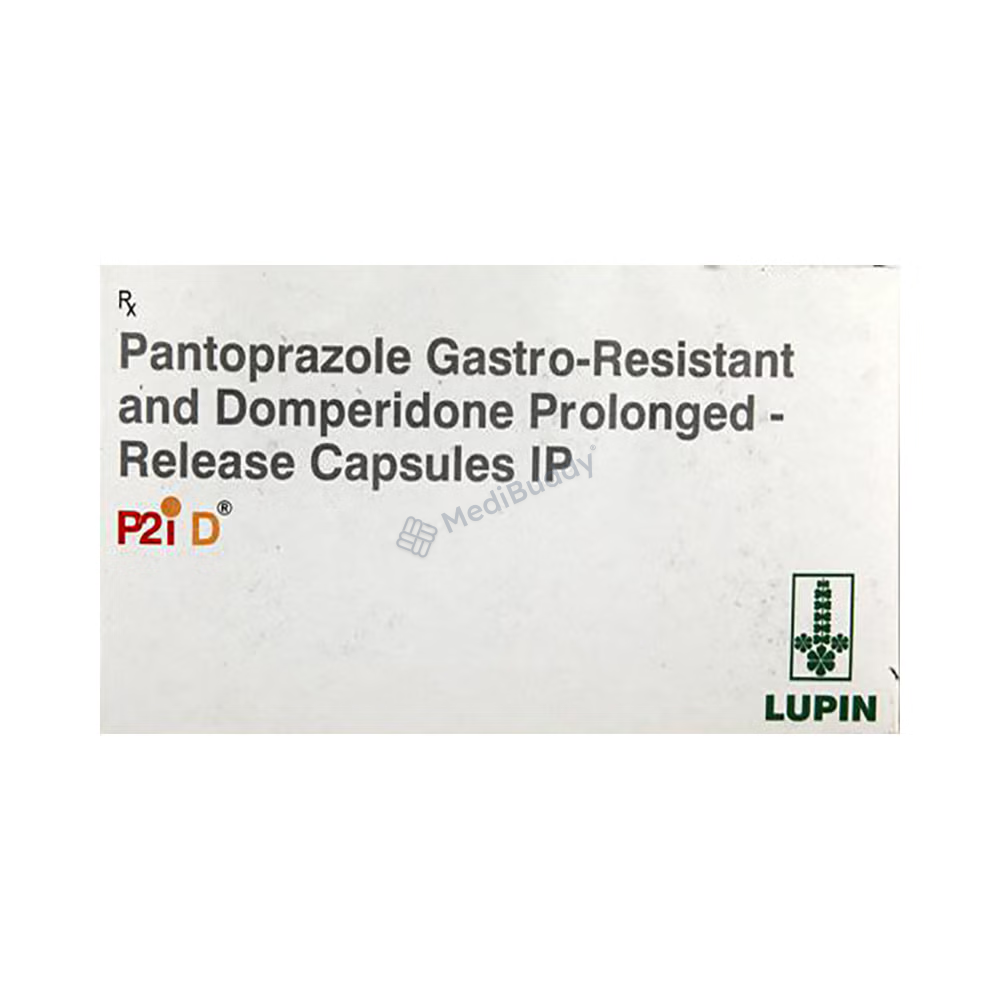 P2i-D Capsule PR contains two active ingredients, Domperidone and Pantoprazole. Domperidone acts as a prokinetic and anti-nausea agent, helping to alleviate indigestion, stomach pain, and bloating by enhancing food movement through the digestive tract. It also blocks the vomiting center in the brain, reducing feelings of nausea. Pantoprazole, a proton pump inhibitor, works by reducing excess stomach acid formation, thus preventing symptoms of peptic ulcers and GERD, such as heartburn. Both components play a role in managing conditions like esophagitis and GERD effectively.
