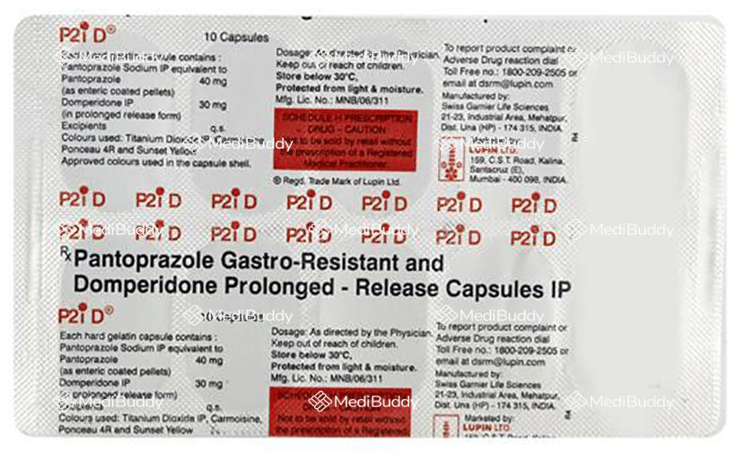 P2i-D Capsule PR is a prescription medication used to treat conditions like gastroesophageal reflux disease (Acid reflux), indigestion, and gastritis. By reducing the amount of acid in the stomach, it helps alleviate symptoms such as heartburn, stomach pain, and irritation. Furthermore, P2i-D Capsule PR neutralizes stomach acid and aids in the smooth passage of gas, thus reducing stomach discomfort. It is important to take this medication as per your doctor's advice, without food. The dosage will vary depending on your condition and response to the medicine. Continuing the treatment for the duration recommended by your healthcare provider is crucial to prevent worsening of symptoms. Inform your healthcare team about all medications you are taking to avoid any interactions.