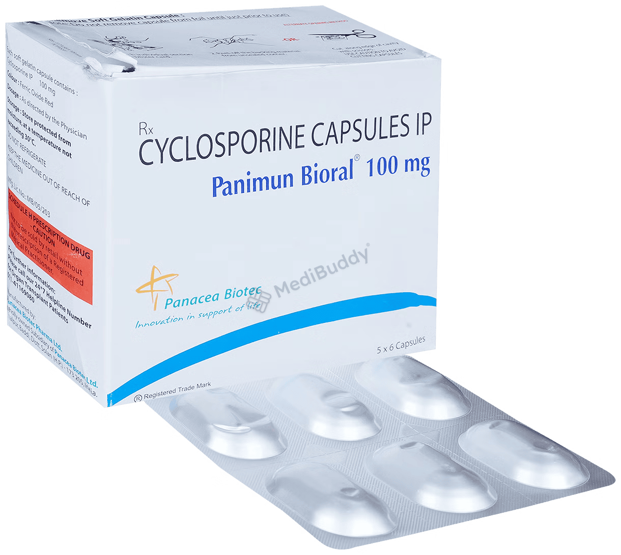 Panimun Bioral 100mg Capsule, containing Cyclosporine, is classified as an immunosuppressant medication. It is mainly used to prevent rejection of transplanted organs like liver, kidney, heart, bone marrow, or stem cells. Additionally, this medication is employed in the treatment of various autoimmune disorders such as psoriasis, rheumatoid arthritis, nephrotic syndrome, atopic dermatitis, and eye inflammation conditions like Behçet's uveitis.