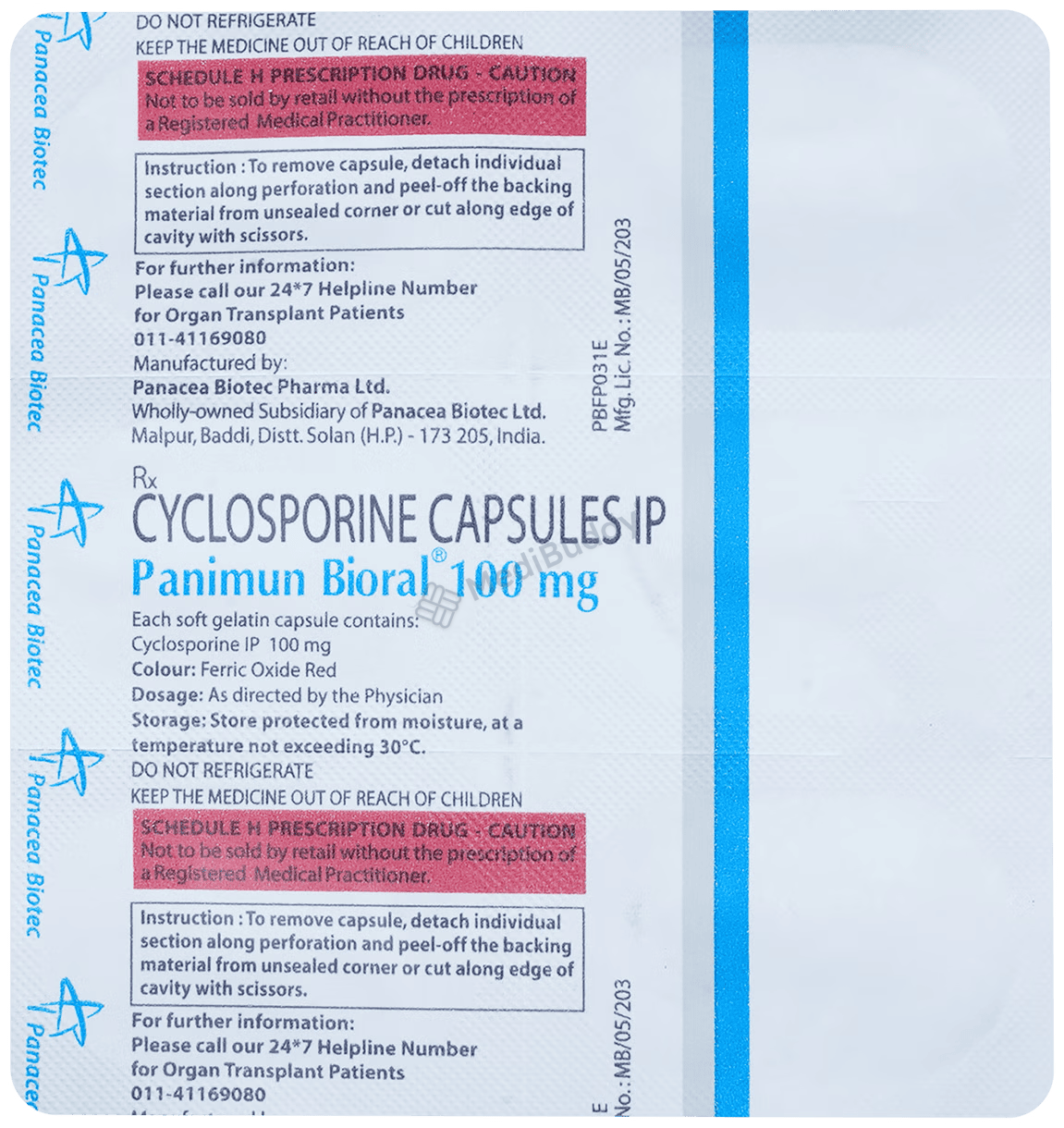 Before consuming Panimun Bioral 100mg Capsule, it is important to take note of certain precautions for your safety. This medication is commonly used to prevent rejection of newly transplanted organs and to treat various conditions like nephrotic syndrome, severe rheumatoid arthritis, and psoriasis. The dosage you should take will be determined by your weight, medical condition, and the purpose of treatment, so it is crucial to follow your doctor's instructions closely. Changing the dose without consulting your doctor can be harmful.