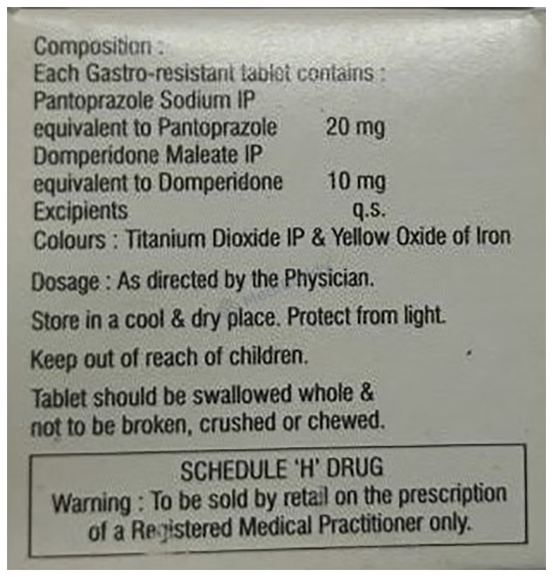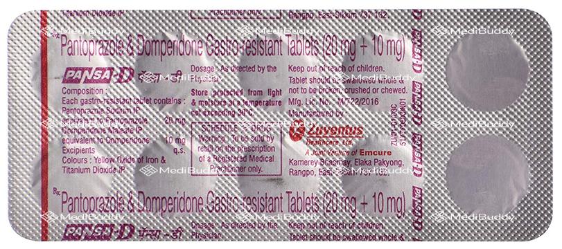 Pansa-D Tablet is a prescription medication that is commonly used to treat conditions such as gastroesophageal reflux disease (Acid reflux), dyspepsia (indigestion), and gastritis. These conditions are alleviated by reducing the amount of acid in the stomach, which helps in relieving symptoms like heartburn, stomach pain, and irritation. The tablet also works to neutralize stomach acid and aids in the smooth release of gas, thereby reducing stomach discomfort. It is important to take this medicine as instructed by your doctor, usually without food. The dosage prescribed will depend on your individual condition and response to the treatment. It is advised to continue taking Pansa-D Tablet for the duration recommended by your healthcare provider to avoid a recurrence or worsening of symptoms if treatment is stopped prematurely.