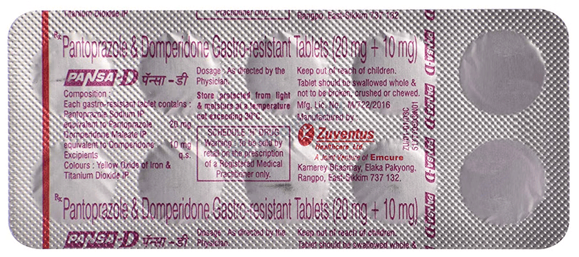 Pansa-D Tablet is used to treat gastroesophageal reflux disease (Acid reflux), dyspepsia (indigestion), and gastritis. It works by reducing stomach acid levels, relieving heartburn, stomach pain, and irritation. The medication also helps neutralize stomach acid, easing gas passage and reducing stomach discomfort. Take as directed by your doctor, continuing treatment as advised to prevent symptoms from returning or worsening. Notify your healthcare provider about all medications being taken. Adjustments in lifestyle, such as avoiding trigger foods, eating smaller meals, and weight management, can enhance treatment of gastroesophageal reflux disease.