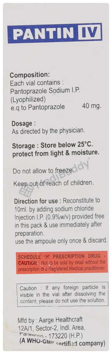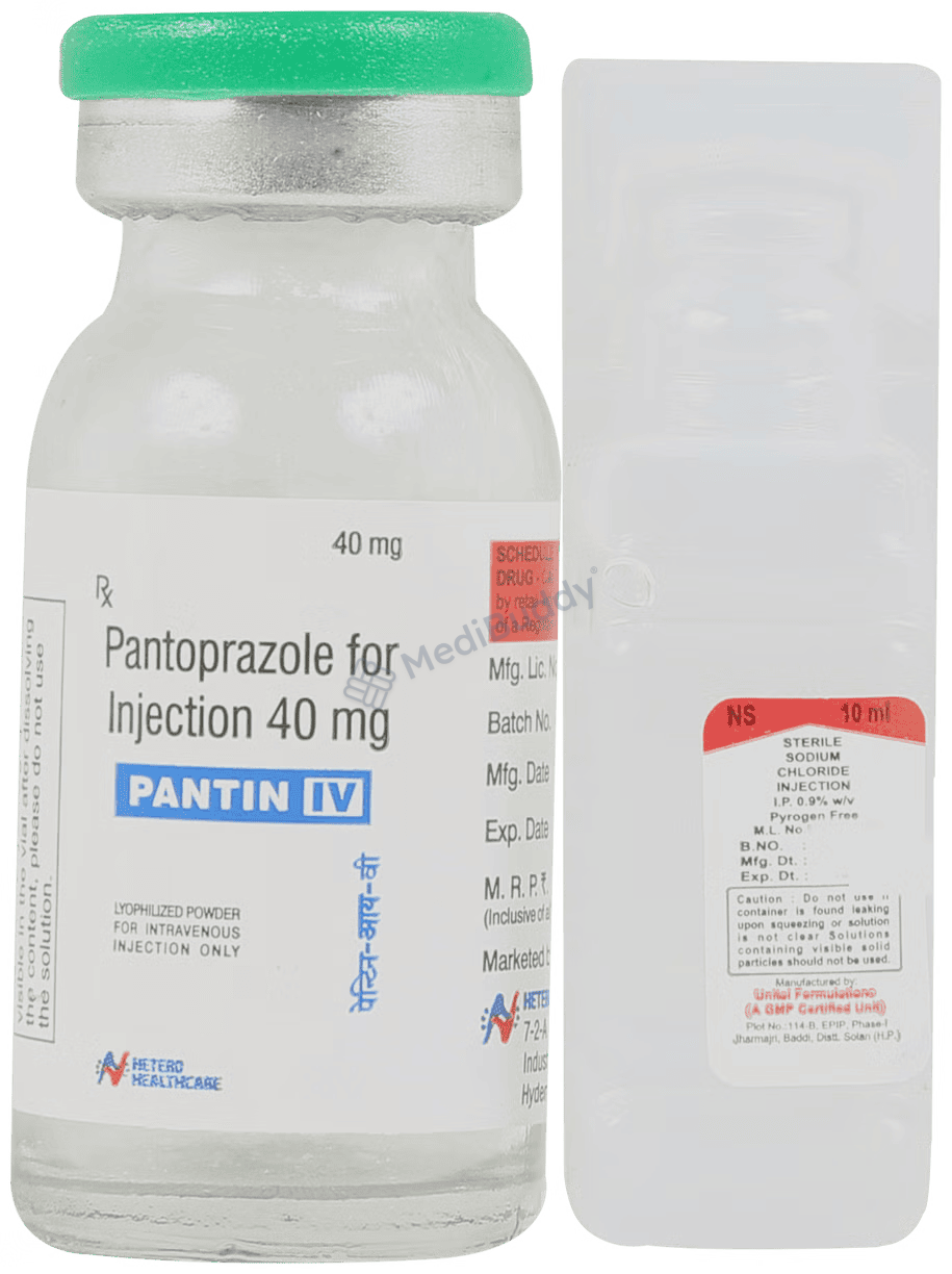Possible mild side effects include nausea, vomiting, headache, and stomach discomfort. Extended use may heighten the risk of side effects; exceeding one year may elevate the likelihood of bone fractures, particularly with higher dosages. Consult your doctor if side effects persist or intensify. Certain individuals, such as those with severe liver issues, HIV medication users, or a history of allergic reactions to similar drugs, should not take Pantin 40mg Injection. Pregnant or nursing women should seek medical advice before usage. Alcohol consumption should be avoided due to potential exacerbation of symptoms. Be cautious when driving or operating machinery if you experience dizziness or drowsiness.