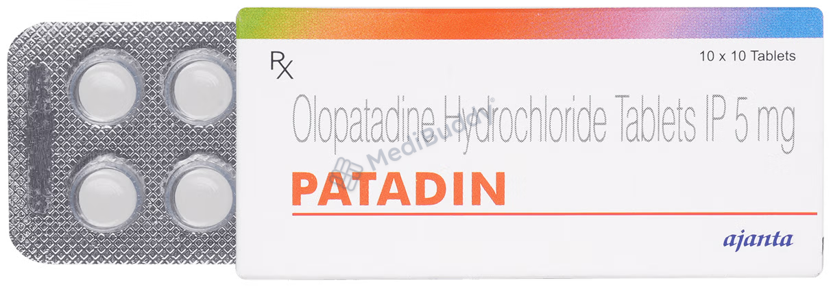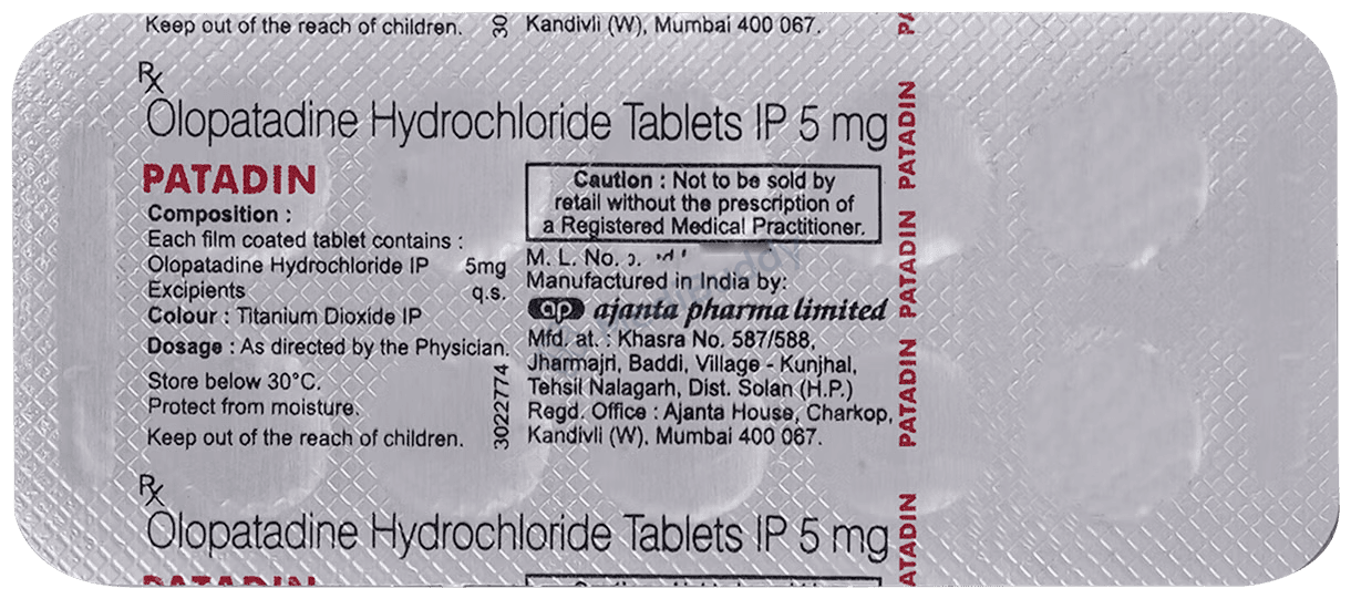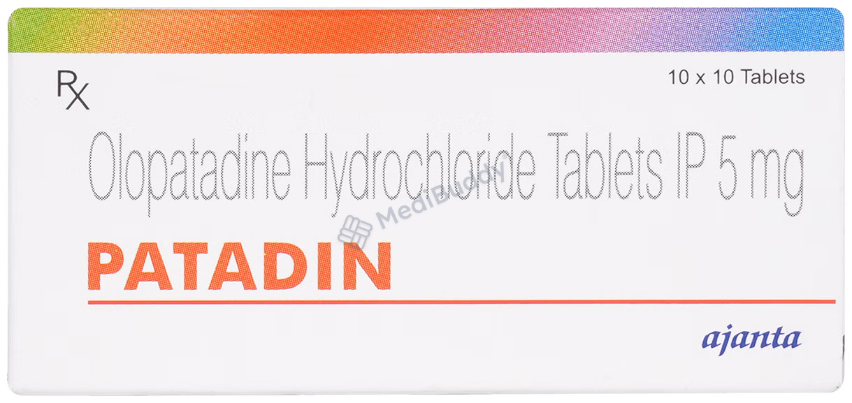 Patadin Tablet 10's, a variation of the medication, belongs to the antihistamine drug class and is primarily utilized in managing allergies and related conditions like allergic rhinitis, hives, and skin itching. Olopatadine, the active ingredient, functions by inhibiting the release of histamine from mast cells, thereby counteracting symptoms such as runny nose, sneezing, and itching. Common side effects of Patadin Tablet 10's encompass sleepiness, malaise, dry mouth, fluid retention, rashes, and itching. These side effects usually subside on their own over time; however, should they persist or intensify, professional medical advice is recommended. Individuals allergic to any components of the tablet should refrain from its usage and consult a healthcare provider before initiating treatment, especially if pregnant, breastfeeding, or consuming other medications. Caution should be exercised while driving or operating machinery due to the potential drowsiness induced by the medication.