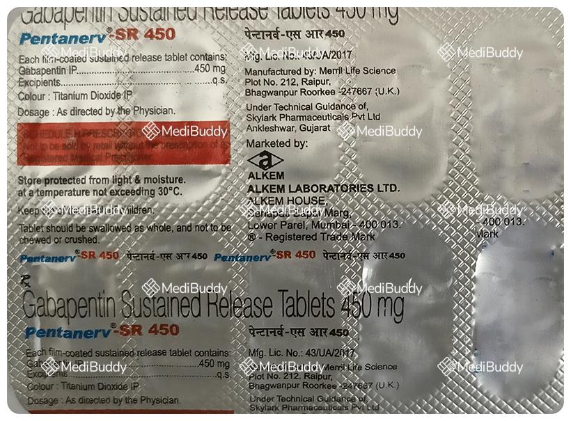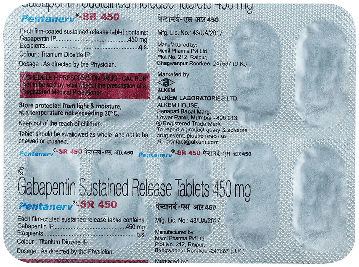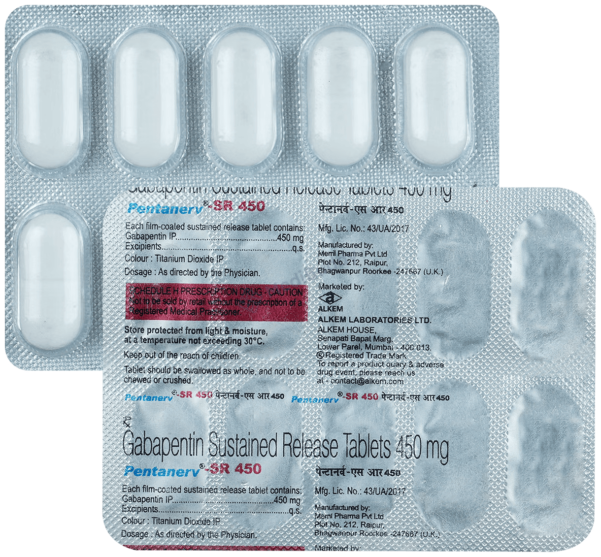 Pentanerv 450mg Tablet SR is a medication used to alleviate nerve pain resulting from conditions like diabetes, shingles, and spinal cord injury. It is also effective in treating certain types of seizures when used in conjunction with other medications. This medicine is classified under the anti-epileptic group and can be taken with or without food, but it is crucial to maintain a consistent daily schedule for maximum effectiveness. The dosage and duration of treatment will be tailored to each individual's condition and response, typically starting with a low dose that is gradually increased. It may take a few weeks for the medication to take full effect, so adherence to the prescribed regimen is essential to achieve optimal results.
