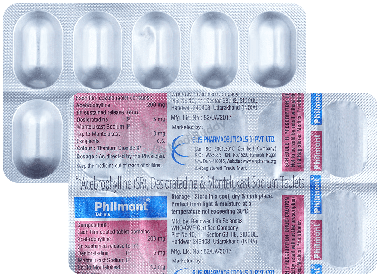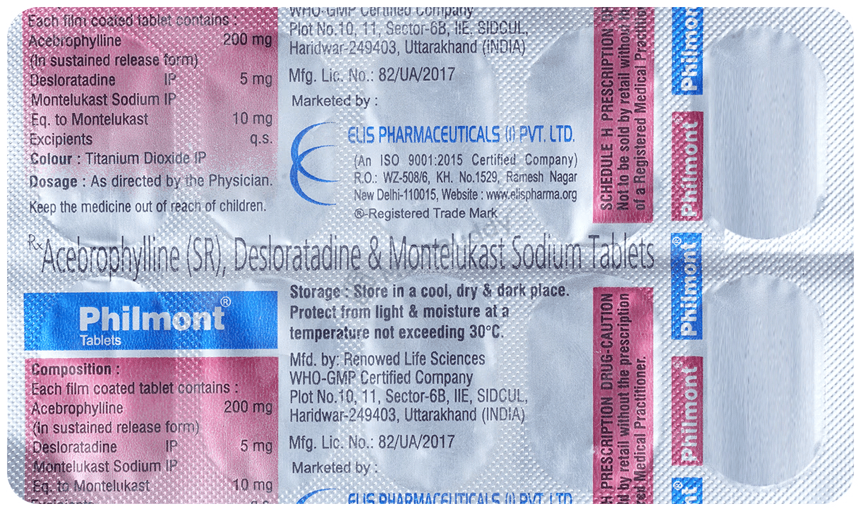 The composition of Philmont Tablet includes three key components: Acebrophylline, Desloratadine, and Montelukast. Acebrophylline acts as a bronchodilator, helping to relax muscles and widen the lung airways. Additionally, it serves as a mucolytic agent, aiding in thinning and loosening mucus in the lungs. Desloratadine functions as an antihistamine by blocking the action of histamine, a substance responsible for allergic reactions. Montelukast, a leukotriene receptor antagonist, works by reducing inflammation and mucus production in the airways.