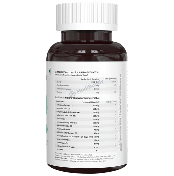 The PowerNosh Nutrition Rise Men Sexual Wellbeing Veg Capsule is a herbal supplement specifically formulated to support men's stamina, vigor, and sexual well-being. This natural product aims to enhance sperm count and quality while also promoting strength and stamina. With key ingredients including Safed Musli, Shatavari, Kaunch Beej, and Maca Root, this capsule is designed to improve testosterone levels and overall vitality.