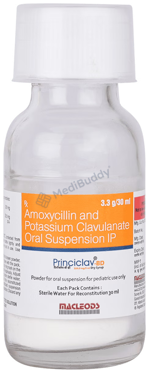 Princiclav -BD Dry Syrup is an antibiotic medication used to treat various bacterial infections in different parts of the body such as the ear, nose, throat, chest, lungs, teeth, skin, and urinary tract. It is especially effective against bacteria that have developed resistance to other treatment options, including cases of tuberculosis resistant to previous therapies.