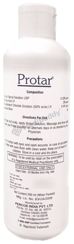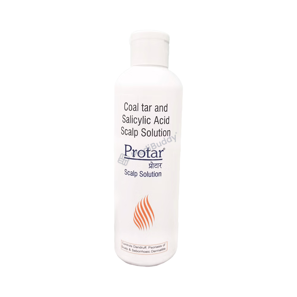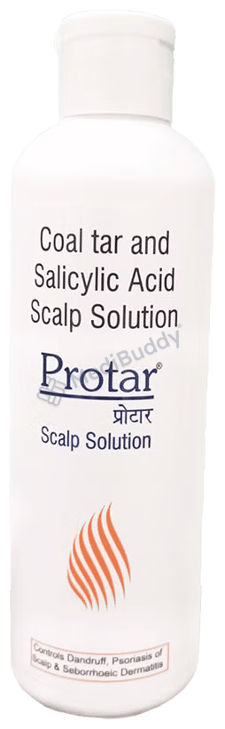 Protar Scalp Solution is a specialized medication that utilizes a blend of Coal tar and Salicylic acid to effectively address skin conditions such as psoriasis, dandruff, neuro dermatitis, and acne. These active ingredients fall under the categories of Keratolytics and Keratoplastics, contributing to the softening of the skin and aiding in the treatment of various scalp and skin disorders. This solution is strictly for external use, and it is crucial to adhere to the prescribed dose and duration as instructed by your healthcare provider.