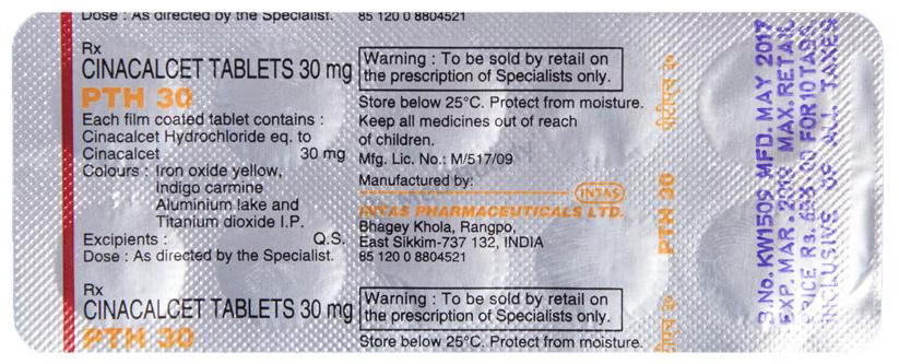 In the case of PTH 30MG Tablet, it contains Cinacalcet, a Calcimimetic agent that enhances the sensitivity of the calcium-sensing receptor to external calcium activation. This medication is used to manage secondary hyperparathyroidism in patients with chronic kidney disease on dialysis and hypercalcemia in patients with parathyroid outgrowth. Secondary hyperparathyroidism occurs due to alterations in bone and mineral metabolism as a result of chronic kidney disease, with the parathyroid gland playing a key role in regulating adaptive responses. PTH 30MG Tablet helps control PTH levels, calcium, and phosphorus in the body to address related conditions effectively.