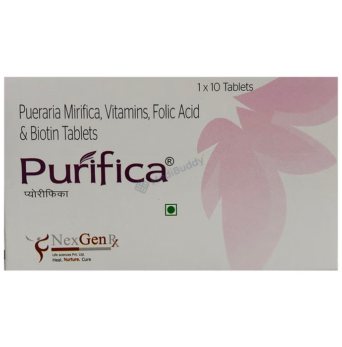 Purifica Tablet is a health supplement designed to provide essential nutrients required for maintaining overall well-being during menopause. This supplement offers comprehensive support for various menopausal symptoms such as hot flashes, night sweats, and mood swings. Key ingredients in Purifica Tablet include Pueraria Mirifica Extract, Pyridoxal 5-Phosphate, Folic Acid, Biotin, and Vitamin B12 (Cyanocobalamin).