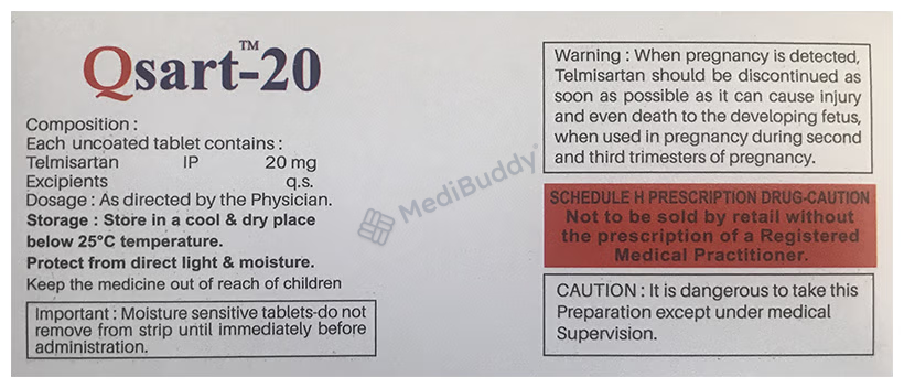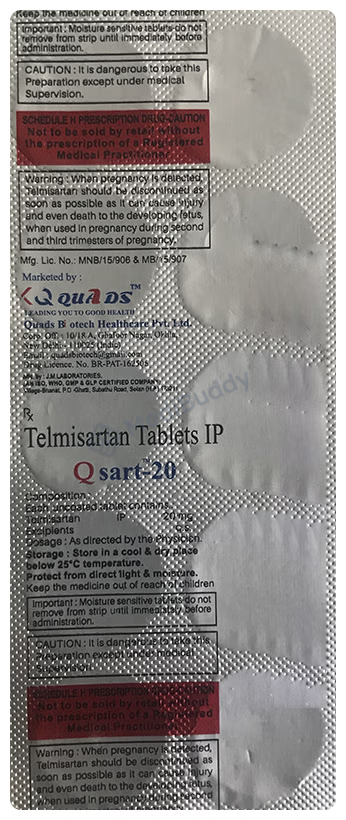 In general, most individuals tolerate Qsart 20 Tablet well with minimal side effects. Nonetheless, some may experience hypotension (low blood pressure) as a potential adverse reaction. In such cases, it is crucial to promptly inform one's doctor to explore potential adjustments in dosage or alternative treatment options. Before commencing this medication, individuals with kidney or liver issues should notify their healthcare provider. Pregnant or nursing individuals should also seek guidance from their doctor due to possible implications on their health and that of the developing baby. Routine monitoring of kidney function, blood pressure, and blood potassium levels is typically recommended during the course of treatment with Qsart 20 Tablet.