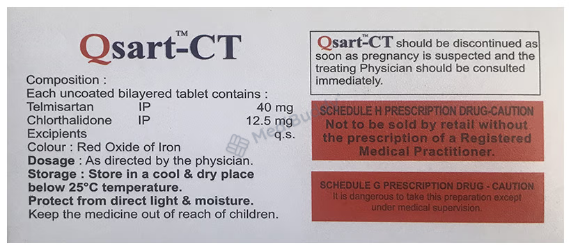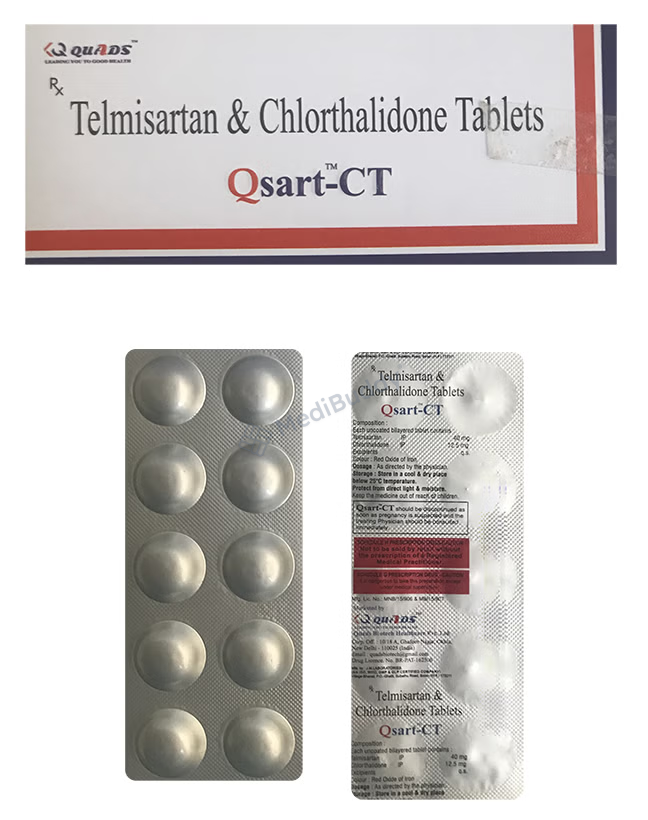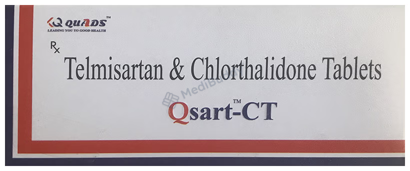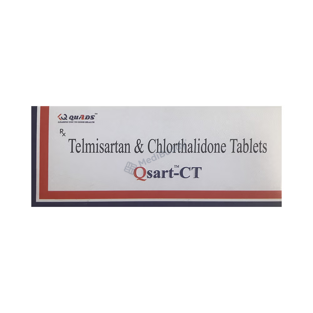 Qsart-CT Tablet is used for high blood pressure, also known as hypertension. It contains Telmisartan and chlorthalidone, which work together to lower blood pressure. Telmisartan helps relax and widen blood vessels, making blood flow easier. Chlorthalidone acts as a diuretic, increasing urine output to reduce blood pressure. It is important to take this medicine regularly as prescribed to effectively control hypertension and lower the risk of heart attack, stroke, or kidney problems. Remember, high blood pressure often has no symptoms, so it's crucial to continue taking the medication as directed by your doctor.