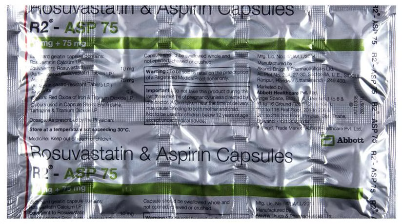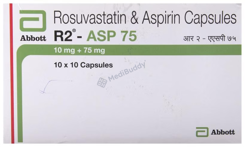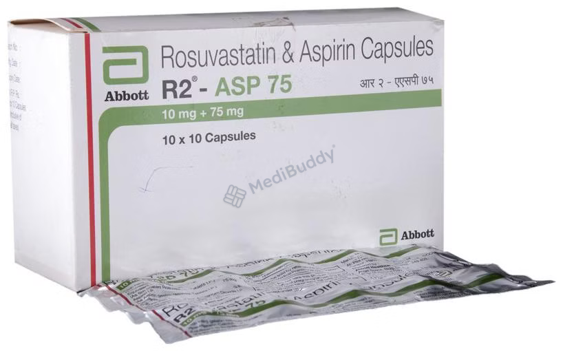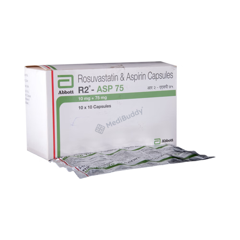 R2-ASP 75 Capsule contains Rosuvastatin and Aspirin, which work together to lower cholesterol levels and prevent blood clot formation. Rosuvastatin reduces LDL cholesterol and increases HDL cholesterol, while Aspirin acts as a blood-thinning agent to prevent heart attacks and strokes. Your doctor will determine the appropriate dosage based on your individual health condition.
