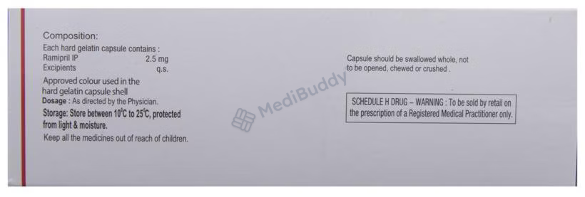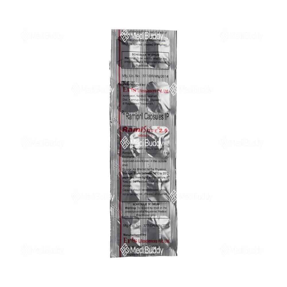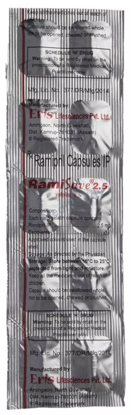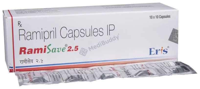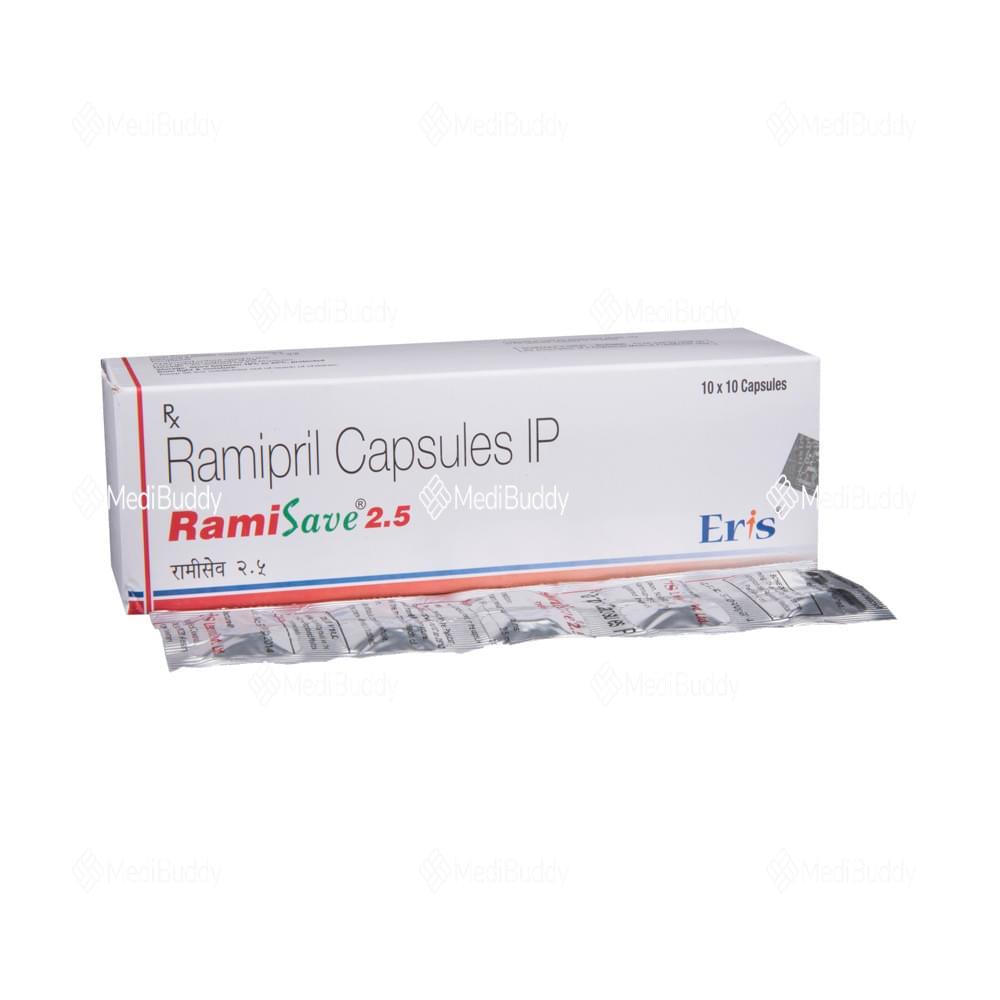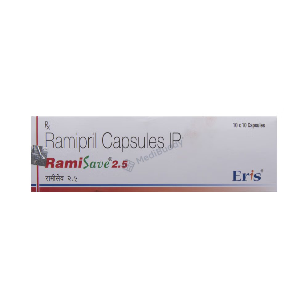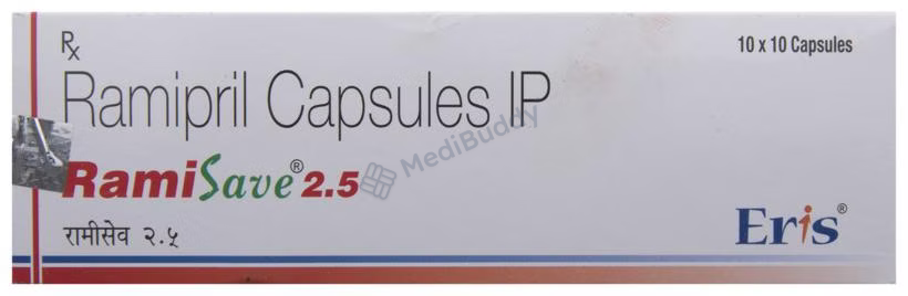 Ramisave 2.5 Capsule is a medication used for conditions like high blood pressure, heart failure, and post-heart attack treatment. It belongs to a group of drugs called ACE inhibitors, which help lower blood pressure and reduce stress on the heart by relaxing blood vessels. Maintaining controlled blood pressure is crucial in preventing heart attacks, strokes, and kidney issues. While most people with high blood pressure don't experience symptoms, consistent use of this medication is vital even if you feel well. Lifestyle changes such as exercise, weight management, and dietary adjustments are also recommended alongside medication.