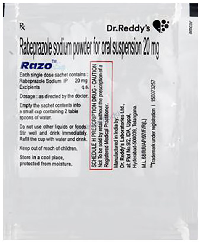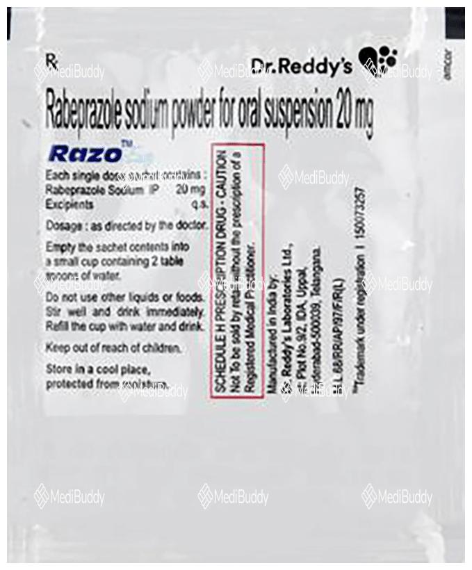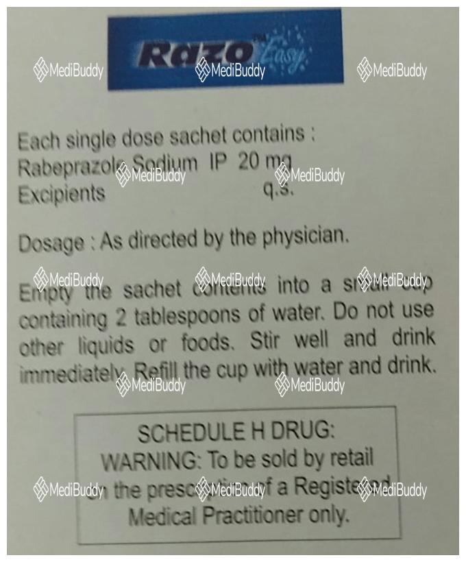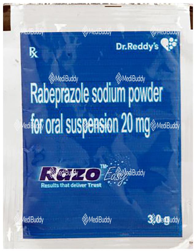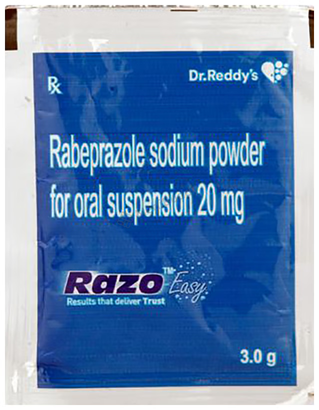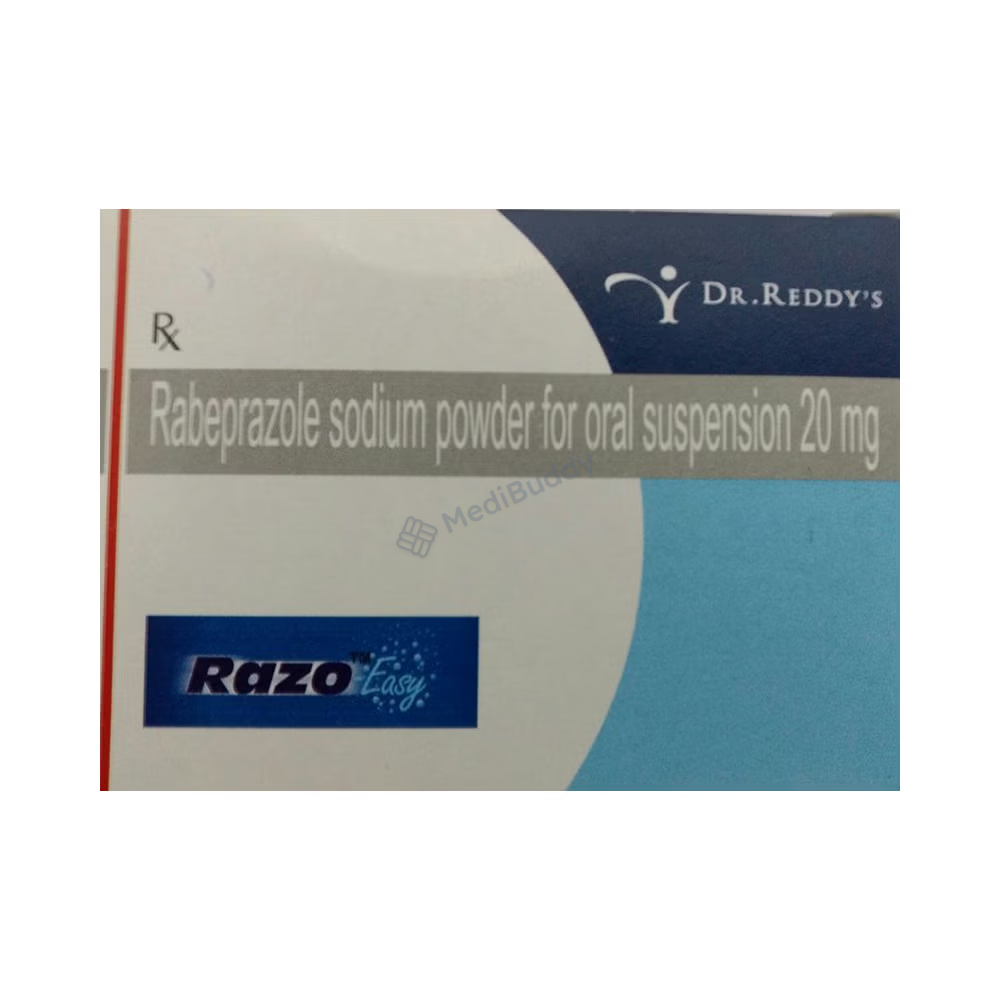 Razo Easy Sachet is a medication used to reduce the production of stomach acid and treat acid-related conditions in the stomach and intestine like acid reflux, peptic ulcers, and Zollinger-Ellison syndrome. It helps relieve symptoms and promote healing. The medicine should be taken one hour before a meal, typically in the morning, following your doctor's dosage instructions. It is essential to maintain a regular schedule for taking the medication even if symptoms improve quickly. Making dietary adjustments such as eating smaller meals more frequently and avoiding caffeinated beverages, spicy, or fatty foods may help improve symptoms.