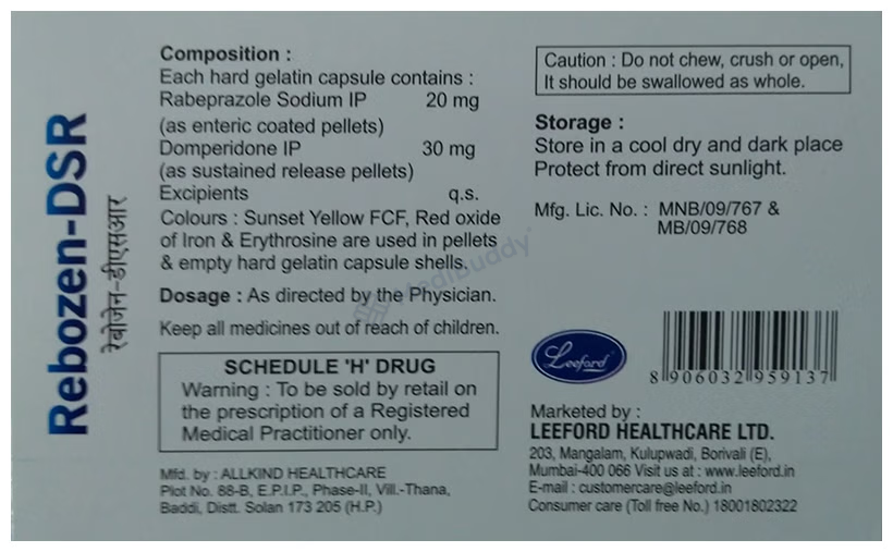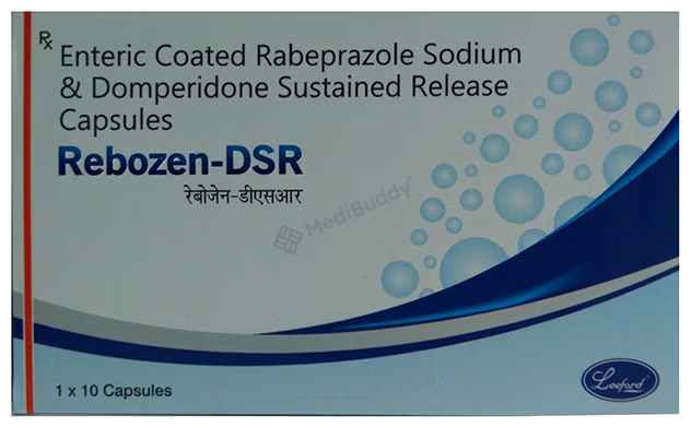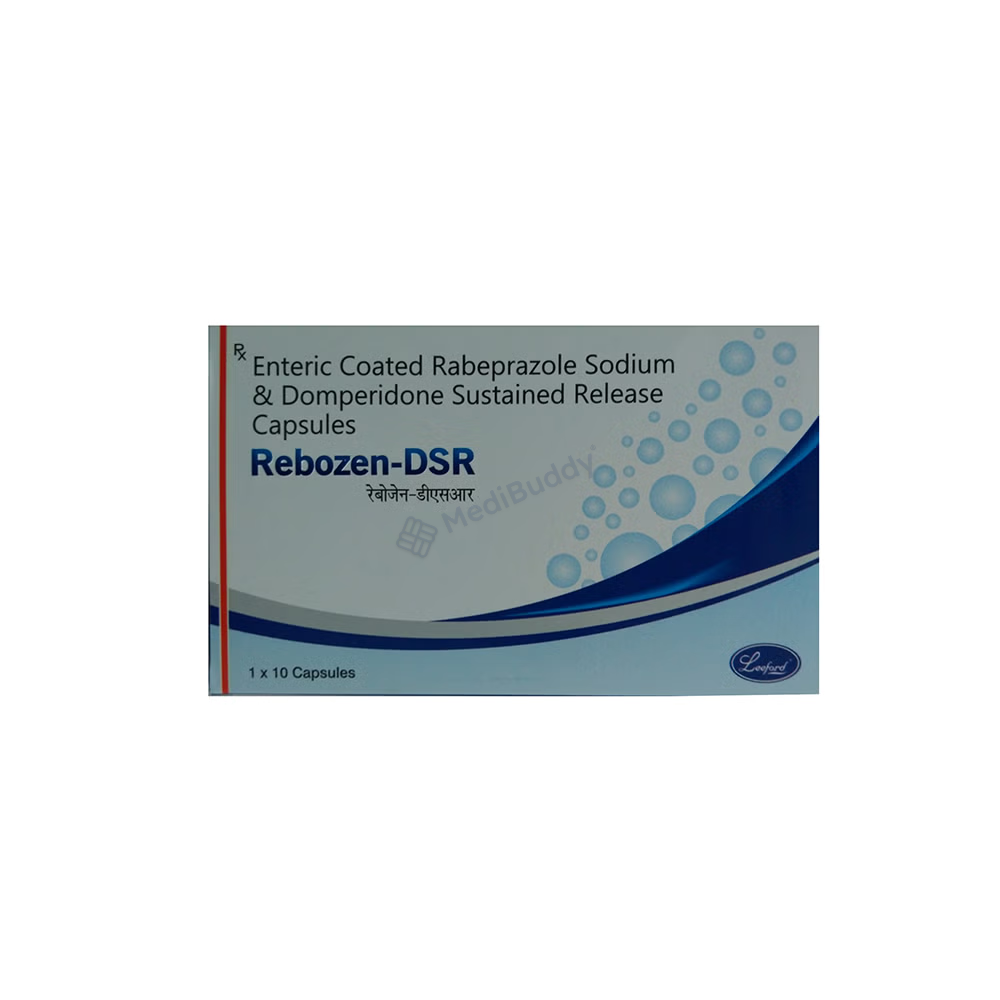 Rebozen-DSR Capsule is a combination medication specifically designed to address symptoms associated with gastroesophageal reflux disease, commonly known as acid reflux. It effectively alleviates the discomfort caused by acidity, such as heartburn, stomach pain, and irritations. Additionally, this capsule neutralizes excess acid in the stomach and aids in the easy passage of gas, thereby reducing stomach discomfort.