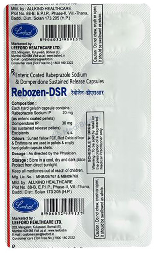 This capsule consists of two key ingredients - Rabeprazole and Domperidone. Rabeprazole functions as a stomach acid reducer, while Domperidone serves as a nausea and vomiting reducer. Together, they work to decrease the production of stomach acid and alleviate symptoms of nausea and vomiting. Rebozen-DSR Capsule is commonly prescribed for conditions like hyperacidity, stomach ulcers, and Zollinger Ellison syndrome, which involves overproduction of stomach acid due to a pancreatic tumor. It is also used for short-term treatment of GERD symptoms.