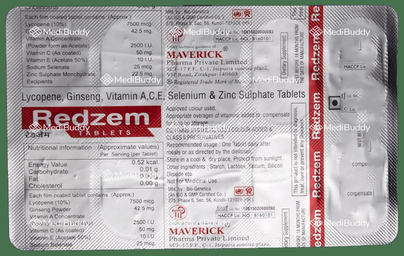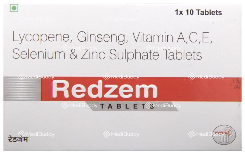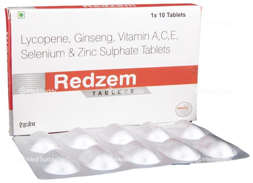 Redzem Tablet is a dietary supplement formulated to enhance cardiac health by stimulating the production of healthy cells and reducing damage. With a blend of key ingredients such as Lycopene, Ginseng, Selenium, Vitamins (A, C, E), and Zinc Sulphate, these tablets are designed to boost immunity, build resistance against diseases, and provide antioxidant-rich support to combat oxidative stress.