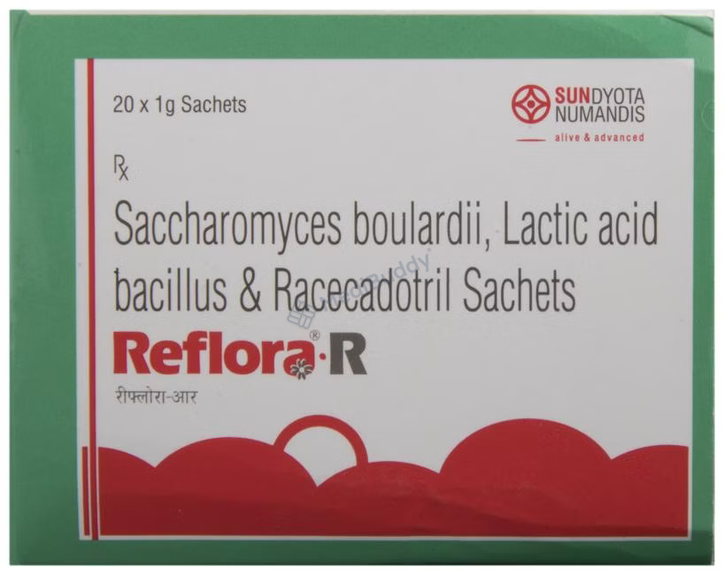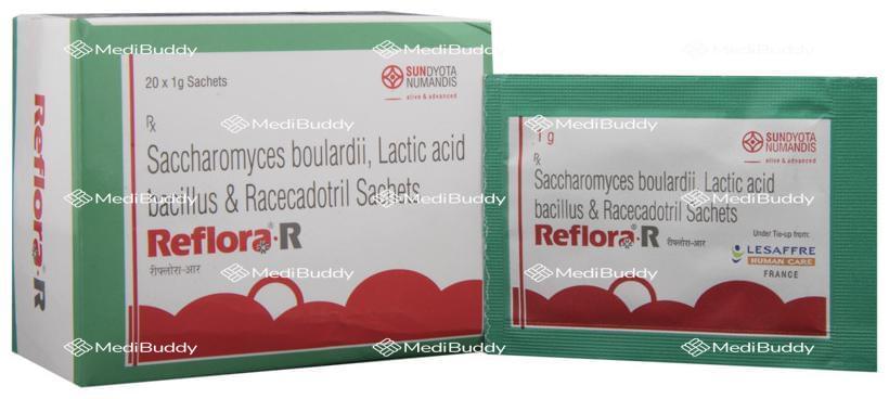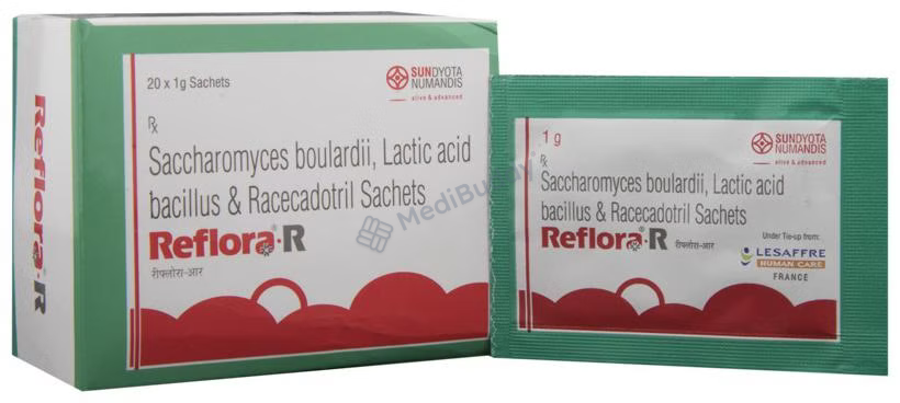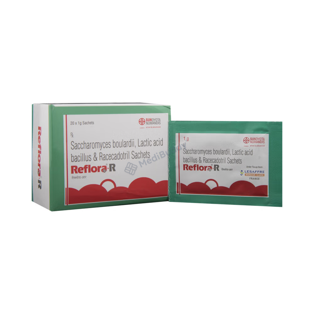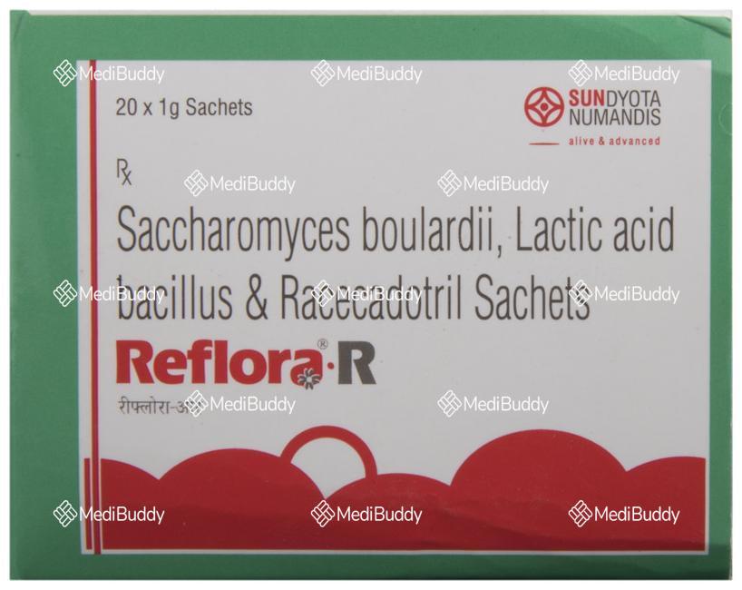 Reflora-R Sachet is a medication that contains three different medicines designed to help alleviate the symptoms of acute diarrhea in infants and children. When a child experiences diarrhea, the body loses essential water and salts through the stools. Reflora-R Sachet works to reduce this loss, aiding in the recovery process. Typically, this medicine is administered orally to the child before or after food intake, preferably alongside an oral rehydration solution (ORS). The dosage regimen usually involves giving the sachet three times a day, although the specific amount may vary based on the child's weight and age.