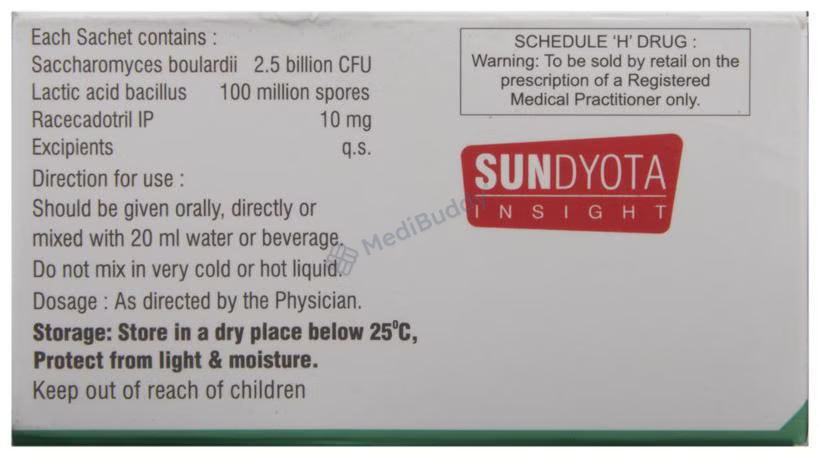 Racecadotril(10mg) + Saccharomyces boulardii(2.5Billion CFU) + Lactobacillus(100Million spores)